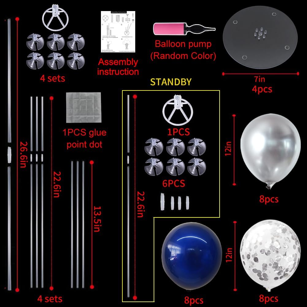 • Package Includes: The balloon stand kit includes 4 reusable balloon centerpiece table decorations and 12 inch 32 pcs Latex Balloons (8 silver balloons,8 grey balloons,8 dark blue balloons,8 silver confetti balloons),glue point dots,balloon pump,balloon clips,and tie tool.You don’t need to waste money to buy balloons