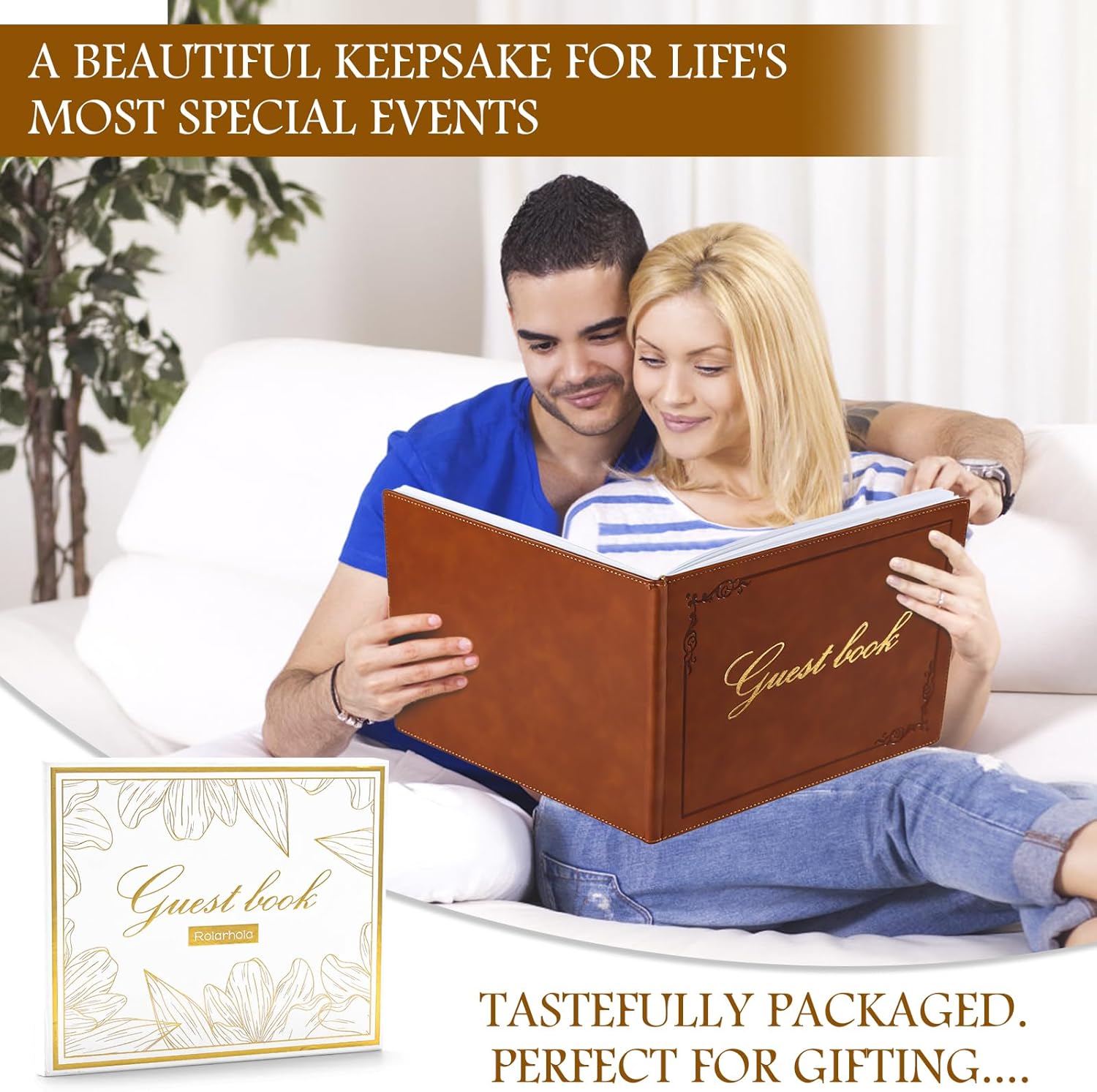 • ELEGANT DESIGN: Treasure your special day in our beautiful guest book. Measuring 8 x 10 inches, it comes with an exquisite PU leather cover, decorated with beautiful gold foil letters and crafted using advanced technology. The shimmering gold accents not only enhance the beauty of the guest book wedding reception, but also its overall quality, making it treasured keepsake for years to come