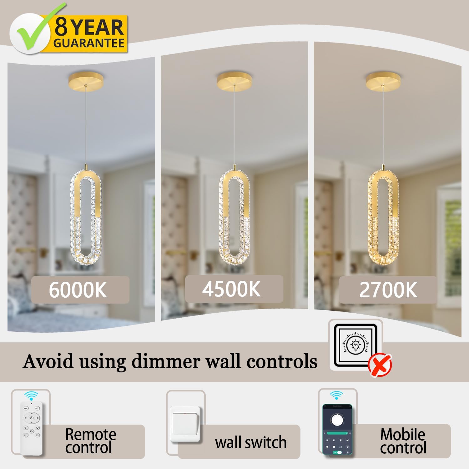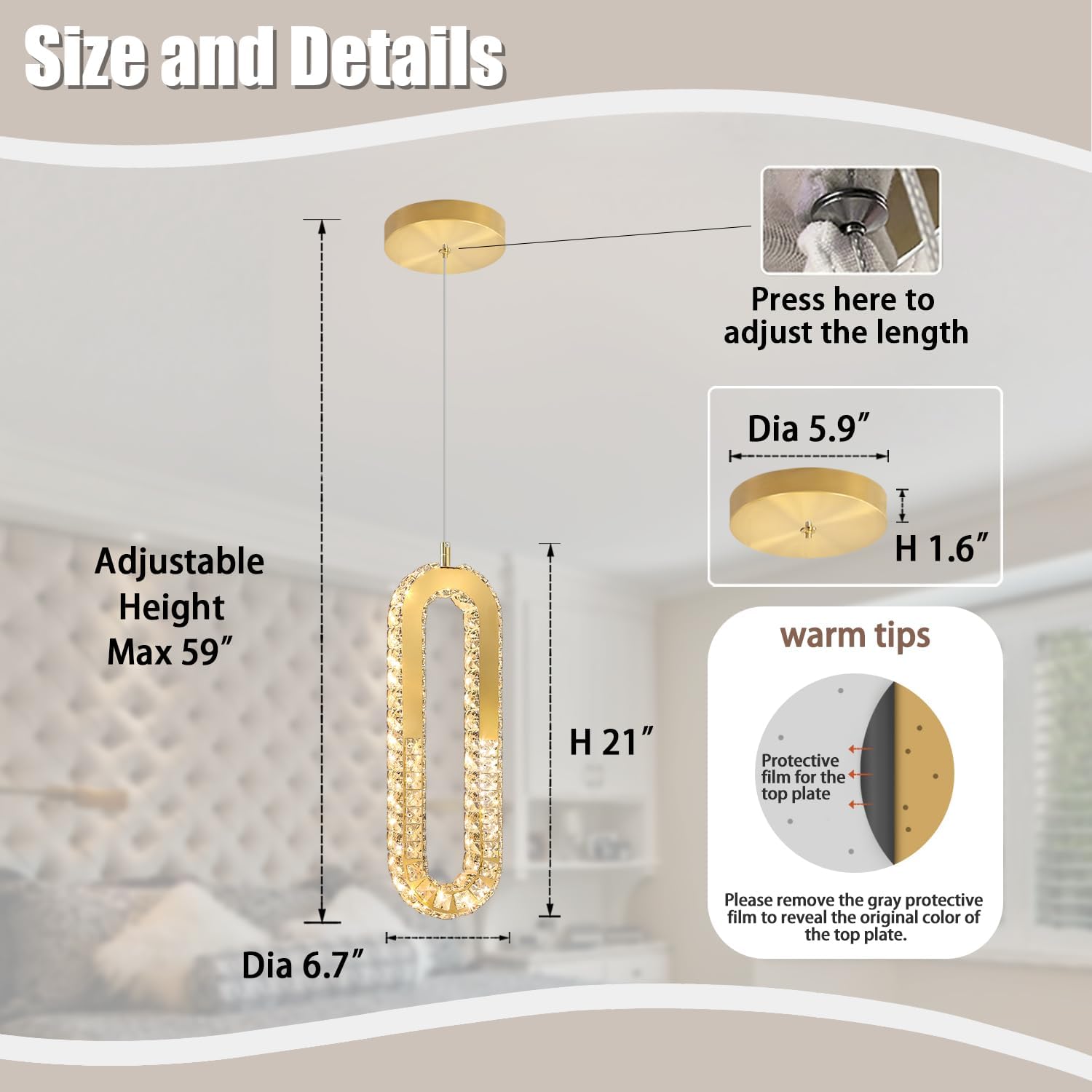 • 【Pendant Light Size】: Made of gold metal and crystal, the pendant light features a gold circular ceiling pan with a diameter of 5.9 inches. The crystal lamp shade has a diameter of 6.7 inches,H 21 inch. The pendant light has an adjustable cord and a total length of 59 inches, allowing you to choose the suitable height for your space.