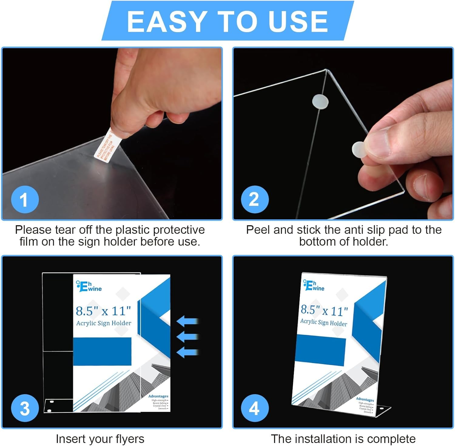 • Easy to Use: Insert 4 anti-slip pads into the base, Each of our Acrylic Sign Holder comes with a peel off film guide, follow the red arrows to peel off the film in seconds, and the plastic sign holder has an opening on its side for easy paper insertion