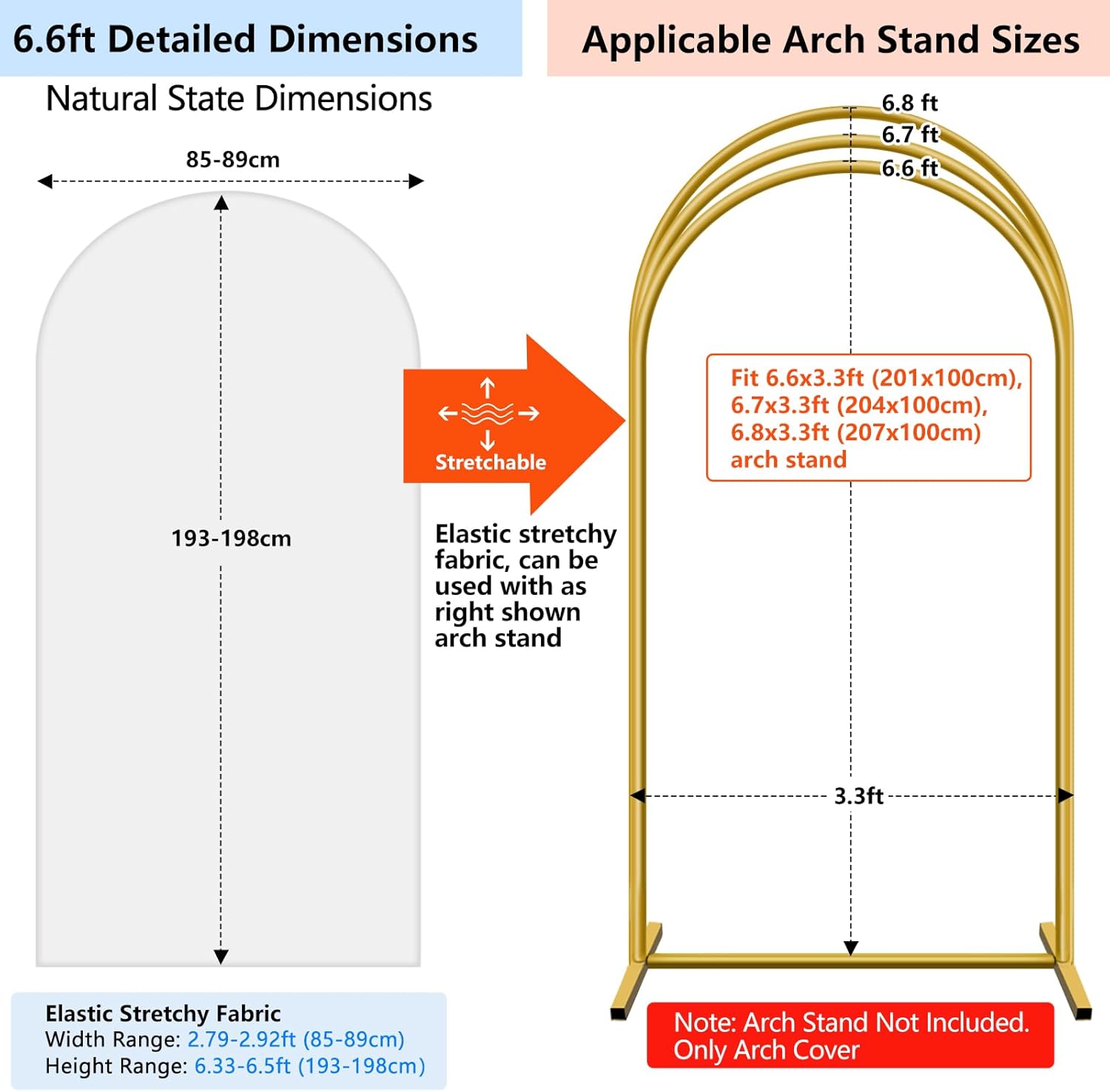 • Applicable Arch Stand Size: The arch cover has good elasticity, and the natural size range is 6.33-6.5 ft high and 2.79-2.92 ft wide. It can be used for arches with a height of 6.6 ft to 6.8 ft and a width of 3.3 ft. ⚠️ Note: Arch stand is not included