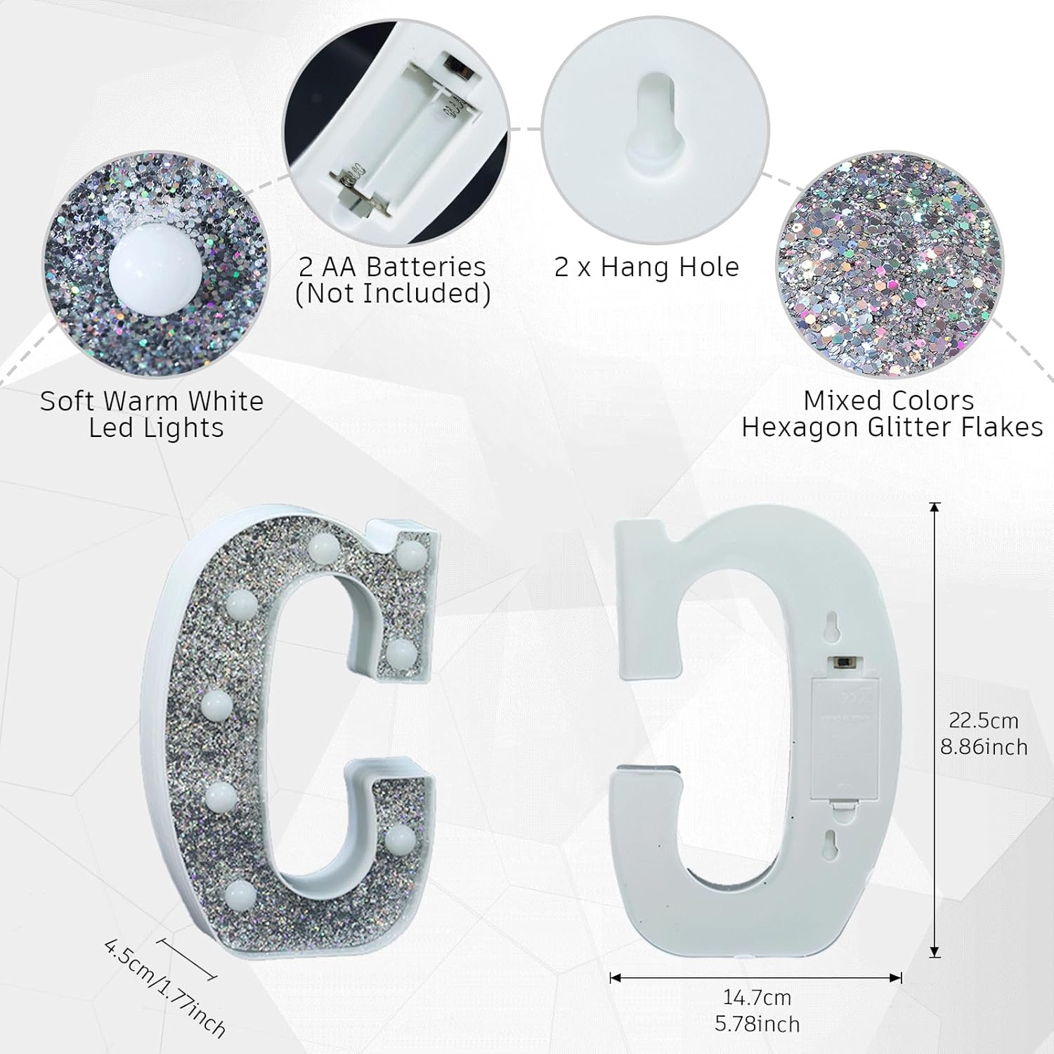 • 💡 Elegant Glitter Light-Up Letters with Silver Diamond Finish: These LED marquee light up letters feature a stunning glitter effect combined with a sophisticated silver diamond surface. Including all 26 alphabet letters and 10 numbers, these light up letters bring sparkle and elegance to any space, making them the perfect light letters for party decor, especially as light up letters for table settings or wall accents.