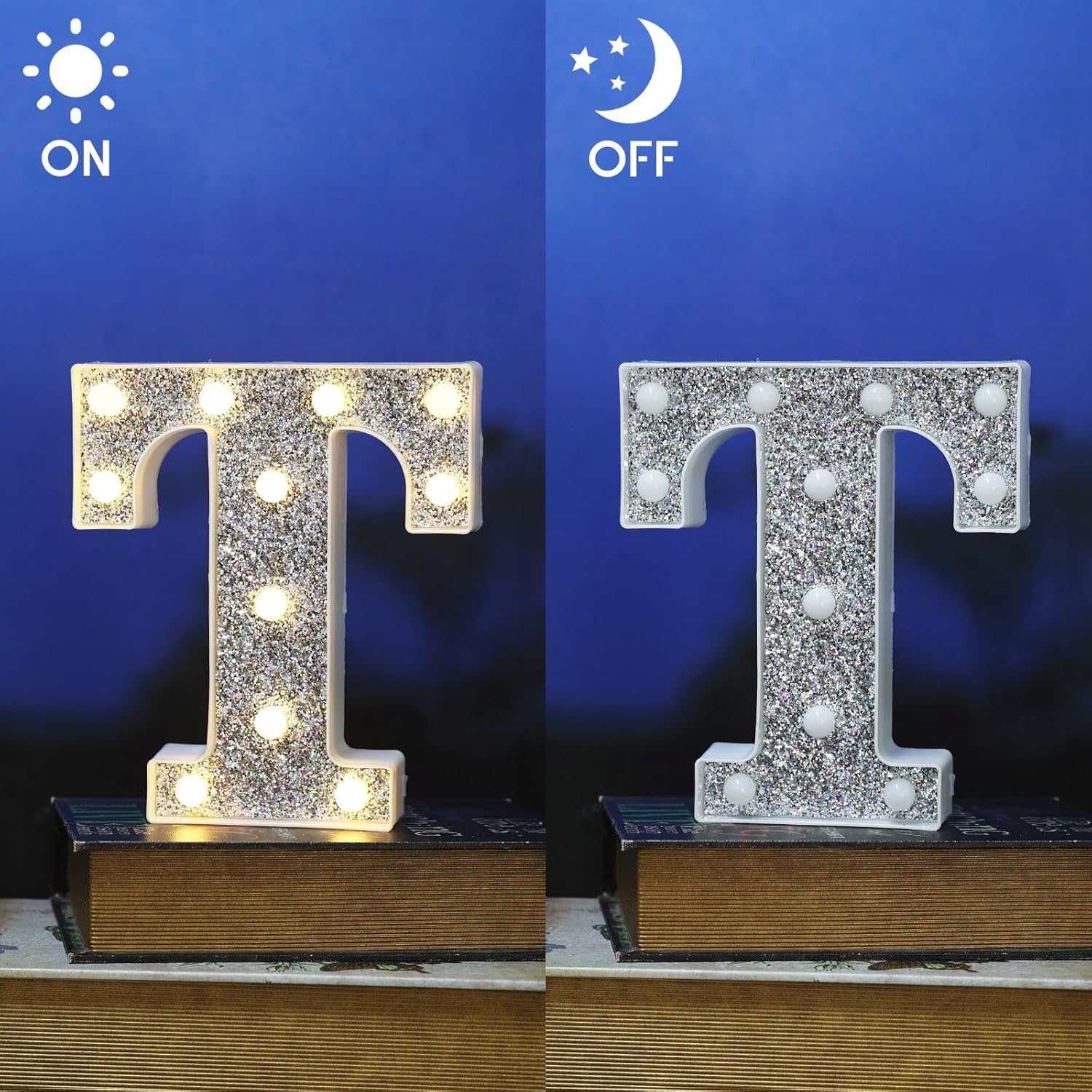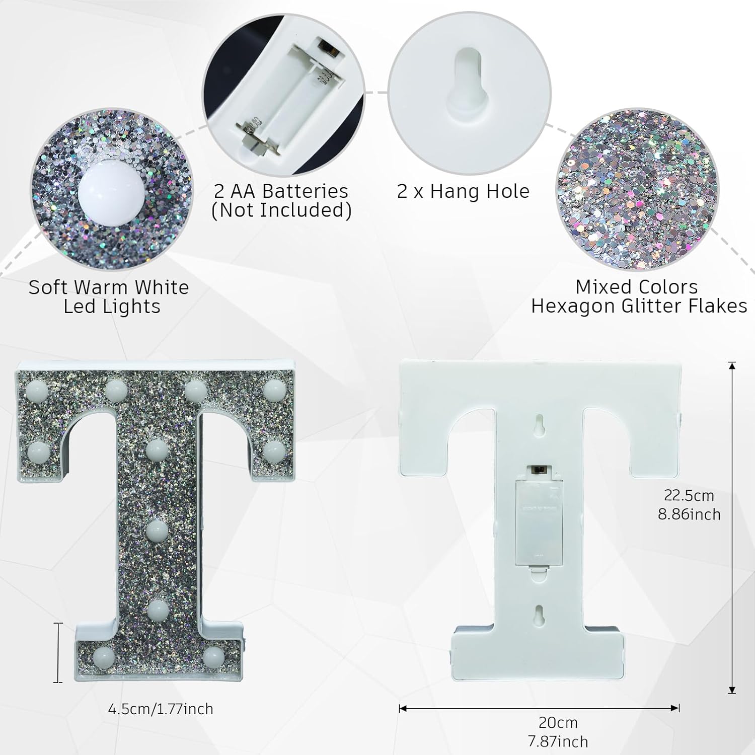 • 💡 Elegant Glitter Light-Up Letters with Silver Diamond Finish: These LED marquee light up letters feature a stunning glitter effect combined with a sophisticated silver diamond surface. Including all 26 alphabet letters and 10 numbers, these light up letters bring sparkle and elegance to any space, making them the perfect light letters for party decor, especially as light up letters for table settings or wall accents.