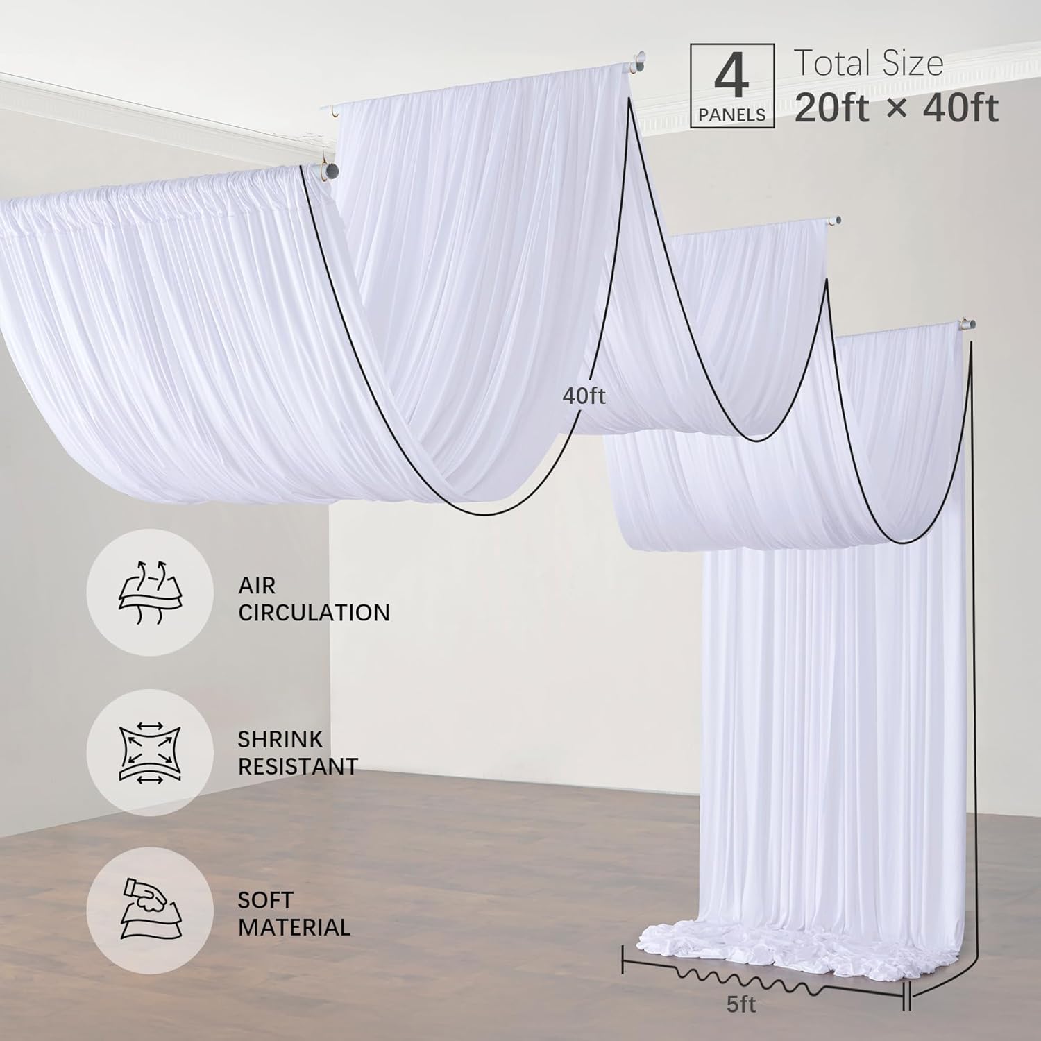 • 40ft Extra Long Ceiling Drapes: 4 Panels 5ftx40ft White Backdrop Curtains for Parties. Totally 20FT(Width) x 40FT(Height). cortinas para fiestas decoracion.