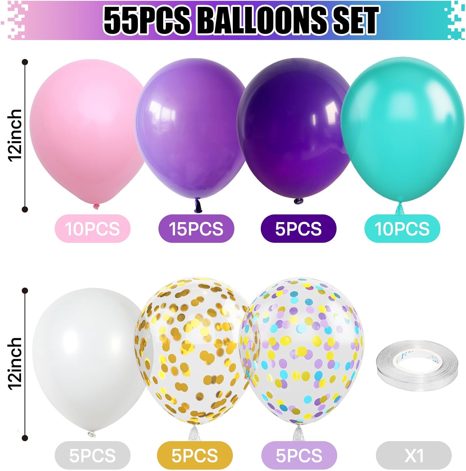 • ๐ŸŽˆ12INCH BLUE PINK PURPLE BALLOONS: The package includes 55 pcs 12 inch balloons: 5 pcs gold confetti balloons, 5 pcs teal purple gold confetti balloons, 5 pcs dark purple balloons, 15 pcs purple balloons, 10pcs pink balloons, 5 pcs white balloons, 10pcs teal balloons and 1pc 10m ribbon. Enough quantity and different colors for satisfying your various decoration needs!