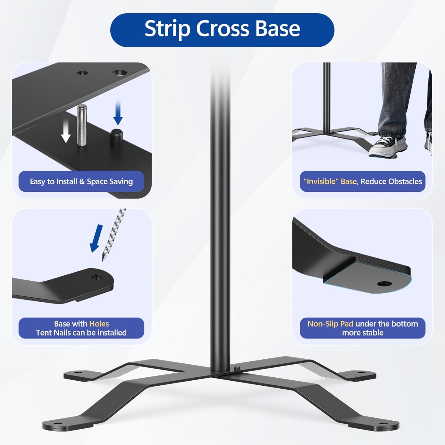 • 【Upgraded Strip Cross Base】1.Easy to Install & Space Saving, our photo backdrop stand kit have thoughtfully adopted a screw design that is fixed to the base, reducing installation steps. 2."Invisible" Base, Reduce Obstacles. 3.Base with Holes, Tent Nails can be installed. 4. Non-Slip Pad under the bottom, more stable.