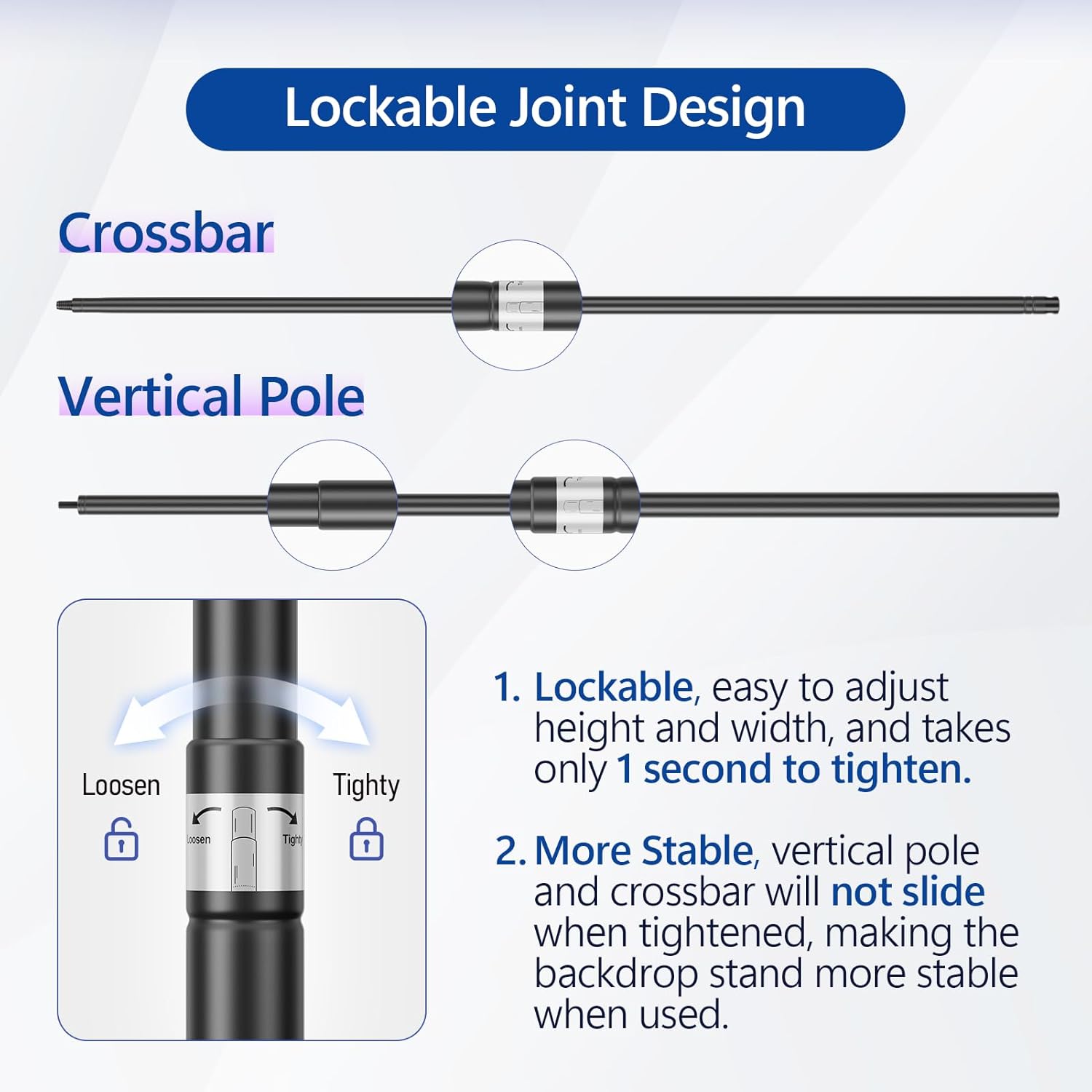 • 【Lockable Joint Design】1.Lockable, The back drop adjustable stand can easy to adjust height and width , and takes only 1 second to tighten. 2. More Stable, vertical pole and crossbar will not slide when tightened, making the photoshoot backdrop stand more stable when used
