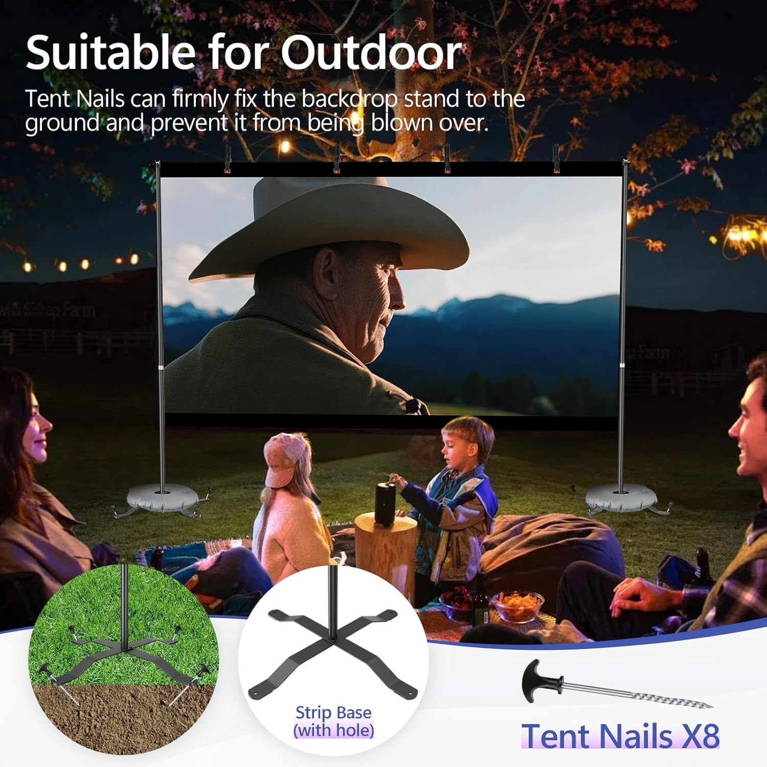 • 【More Suitable for Outdoor】Backdrop stand kit equipped with 8 tent nails that can be inserted into holes in the strip base, tent nails can firmly fix the Projector Screen stand to the ground and prevent it from being blown over. In addition, when used indoors, 2 water weight bags can be used to make the background support system kit more stable.