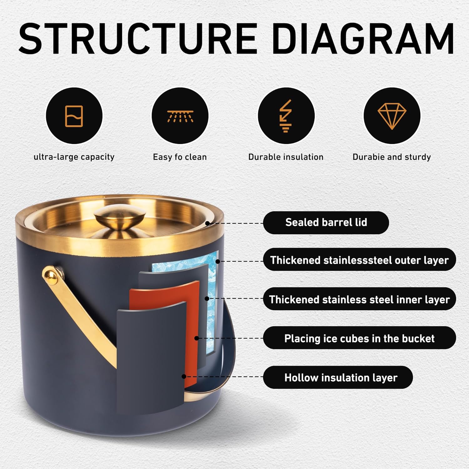 • 3. With a three-layer vacuum insulation and thickened stainless steel structure, this ice bucket features exclusive technology for faster and more lasting chilling effects, ensuring a safer usage experience. It includes an ice drain and an ice scoop for convenient ice handling. The design is smooth and refined.