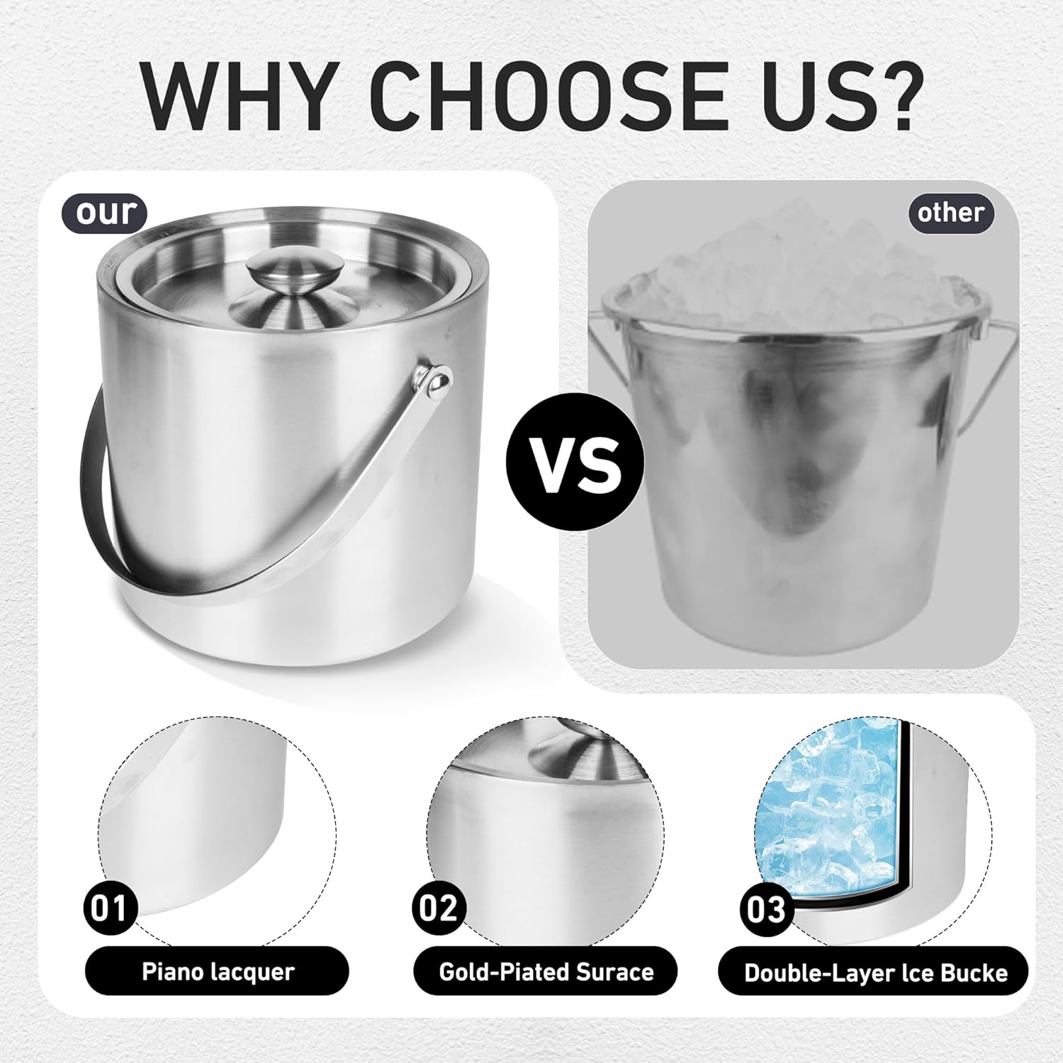 • 2. This ice bucket is made of high-quality stainless steel, sturdy and durable, featuring a shiny mirror finish for a comfortable touch. The brushed interior makes cleaning very easy, making it the best choice for family gatherings, outdoor picnics, bars, and KTV.