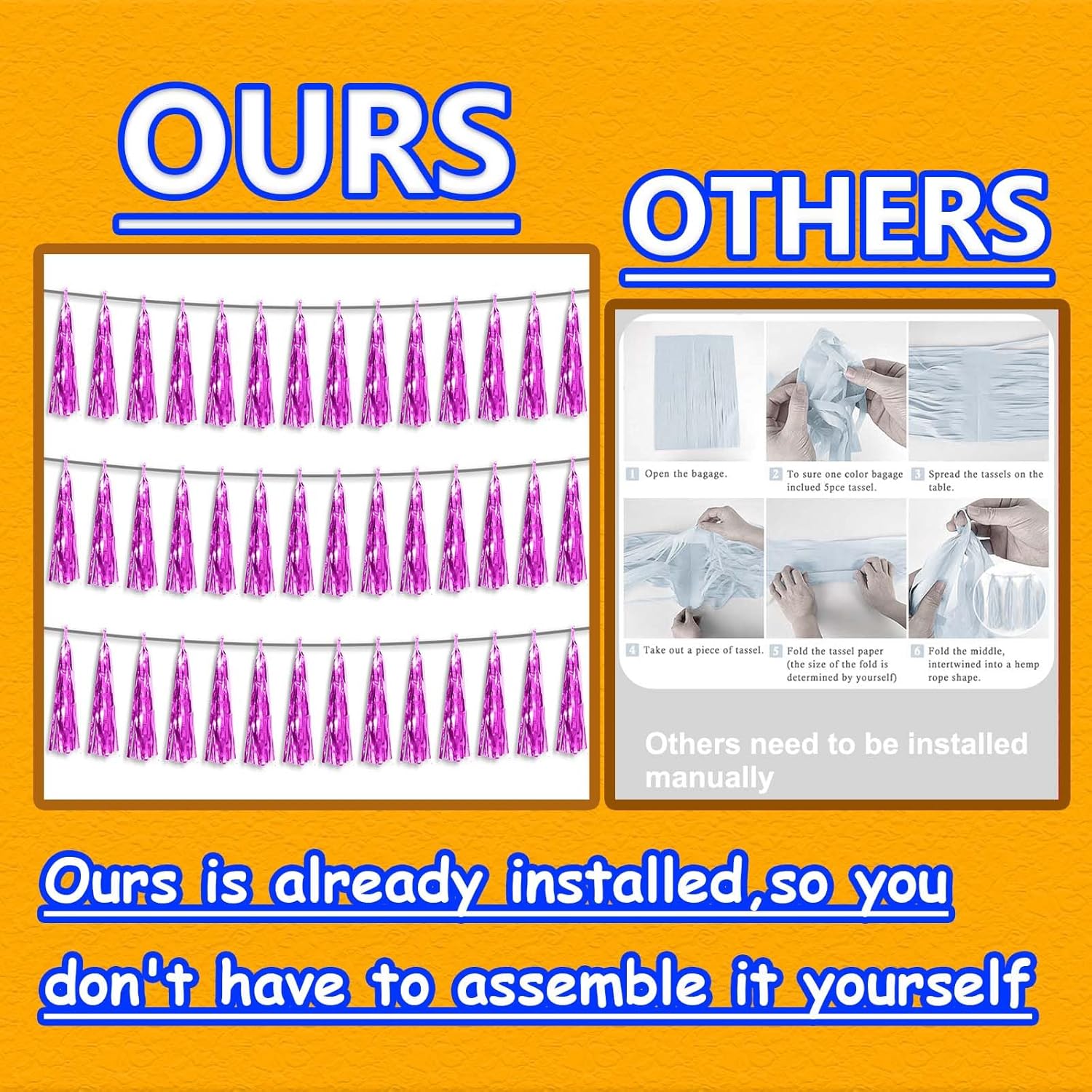 • 【Premium Reusable Tassel Material】: Our glitter fringe garland is made of high-quality PET material, with the virtue of nice craftsmanship and light weight which is safe and recyclable. And the smooth touch makes tassels easy to tidy up. They come with white ribbon for hanging, and garland tassels hang perpendicular to the string, and are adjustable to provide you with the option of spreading the tassels out or piecing them closer together.