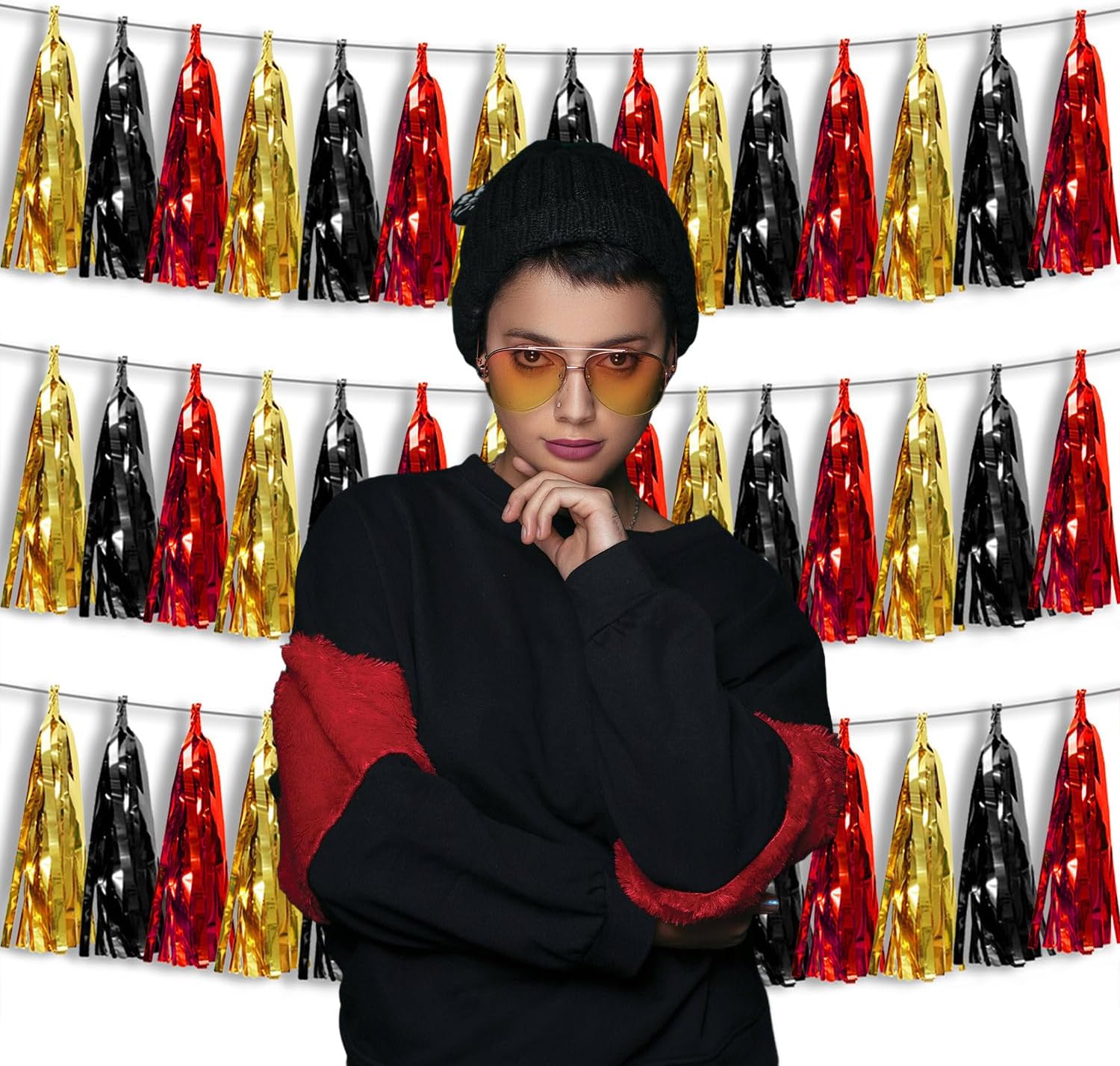 • 【Package Includes】The total length of the red black gold birthday tassels banner is 30 feet, divided into 3 strips, each 10 feet long. Each banner contains 15 tassels, and each tassel measures 14 inches, for birthday decorations many occasions uitable for Patriotic display, omecoming Float, Christmas Float, ecorative metal trailers, graduation floats etc