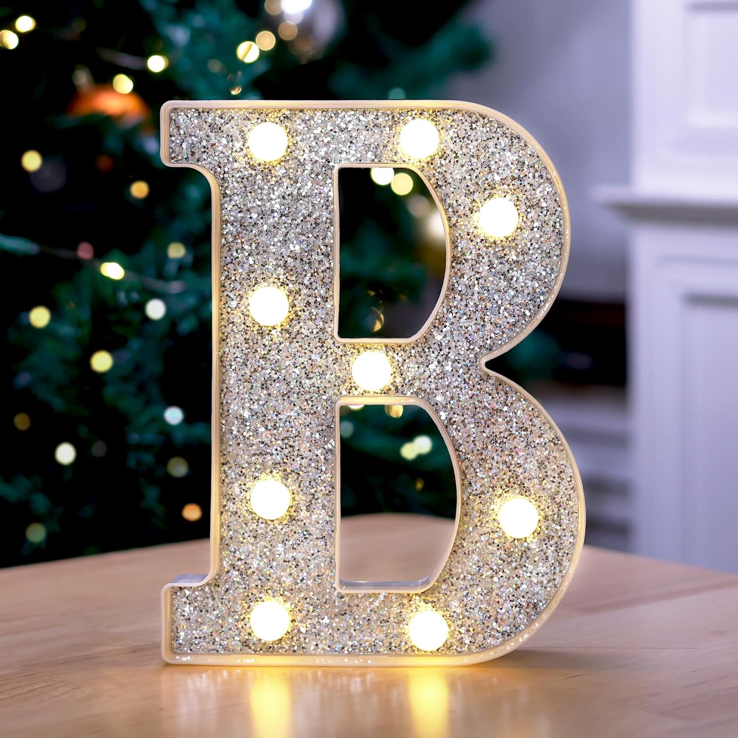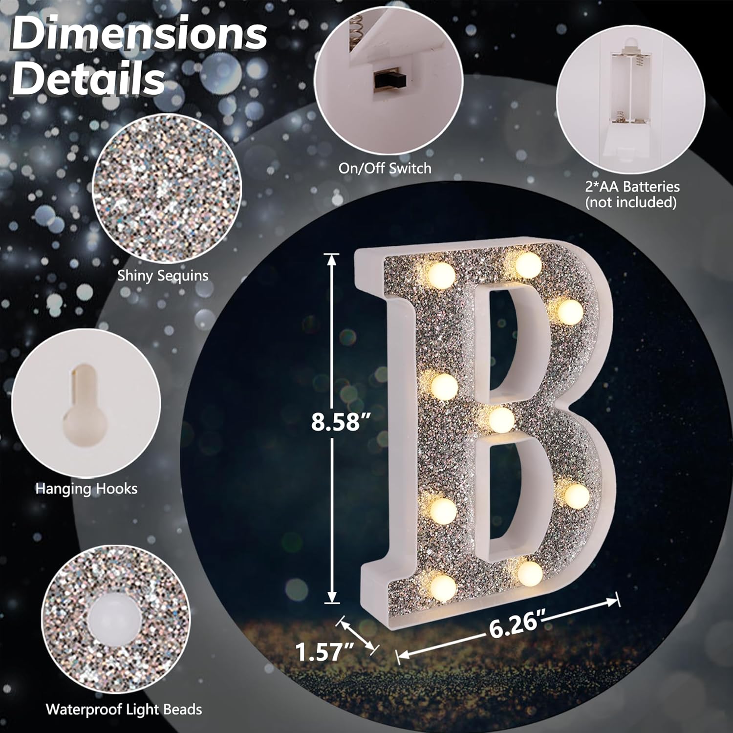 Marquee Light Up Letters, Glitter Silver LED Letter Lights Battery Powered Alphabet Letter Sign for Night Light Wedding Birthday Party Cafe Bar Decoration Girls Room Decor - B