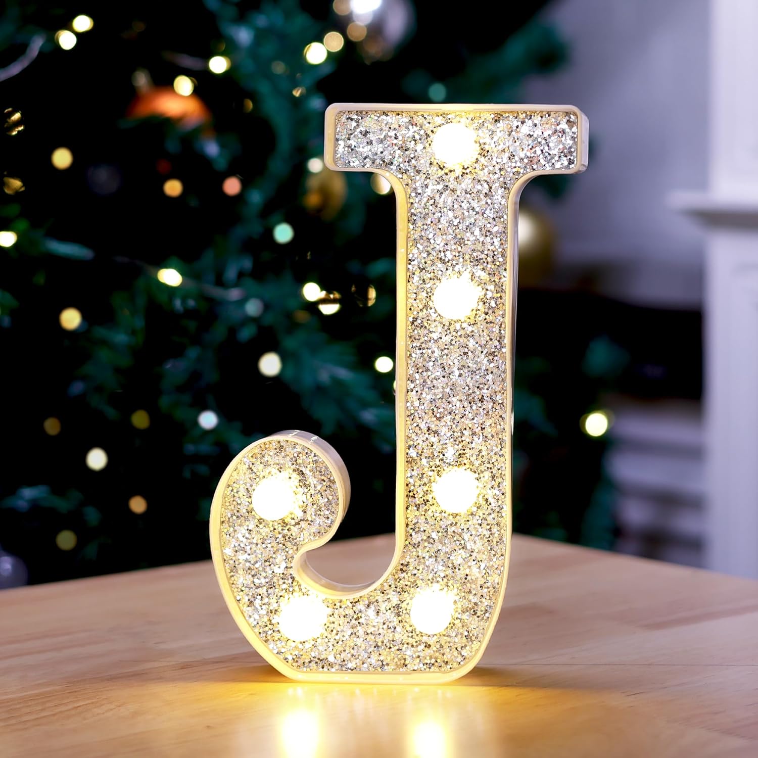 Marquee Light Up Letters, Glitter Silver LED Letter Lights Battery Powered Alphabet Letter Sign for Night Light Wedding Birthday Party Cafe Bar Decoration Girls Room Decor - J
