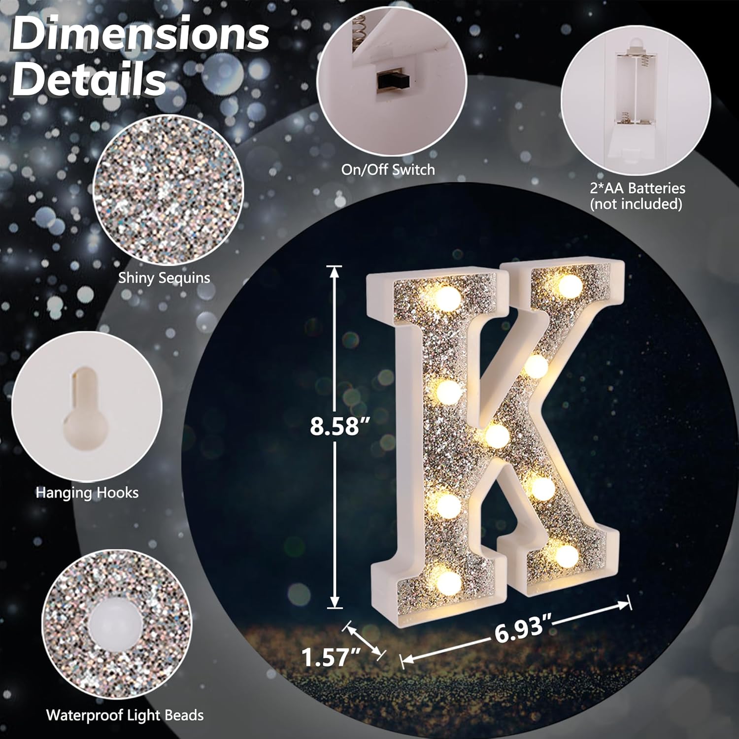 Marquee Light Up Letters, Glitter Silver LED Letter Lights Battery Powered Alphabet Letter Sign for Night Light Wedding Birthday Party Cafe Bar Decoration Girls Room Decor - K
