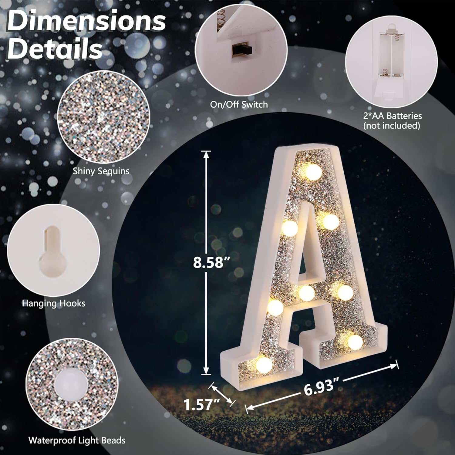 • 【Glitter Silver Marquee LED Letters】Unlike normal white lighted letters, these LED letter lights are covered with shiny silver glittering sequins. Whether it is turned on or off, these glitter marquee lights give a bright eye-catching glow. You can use it to beautify your dining table and light up your party. Create a dreamlike and romantic atmosphere.