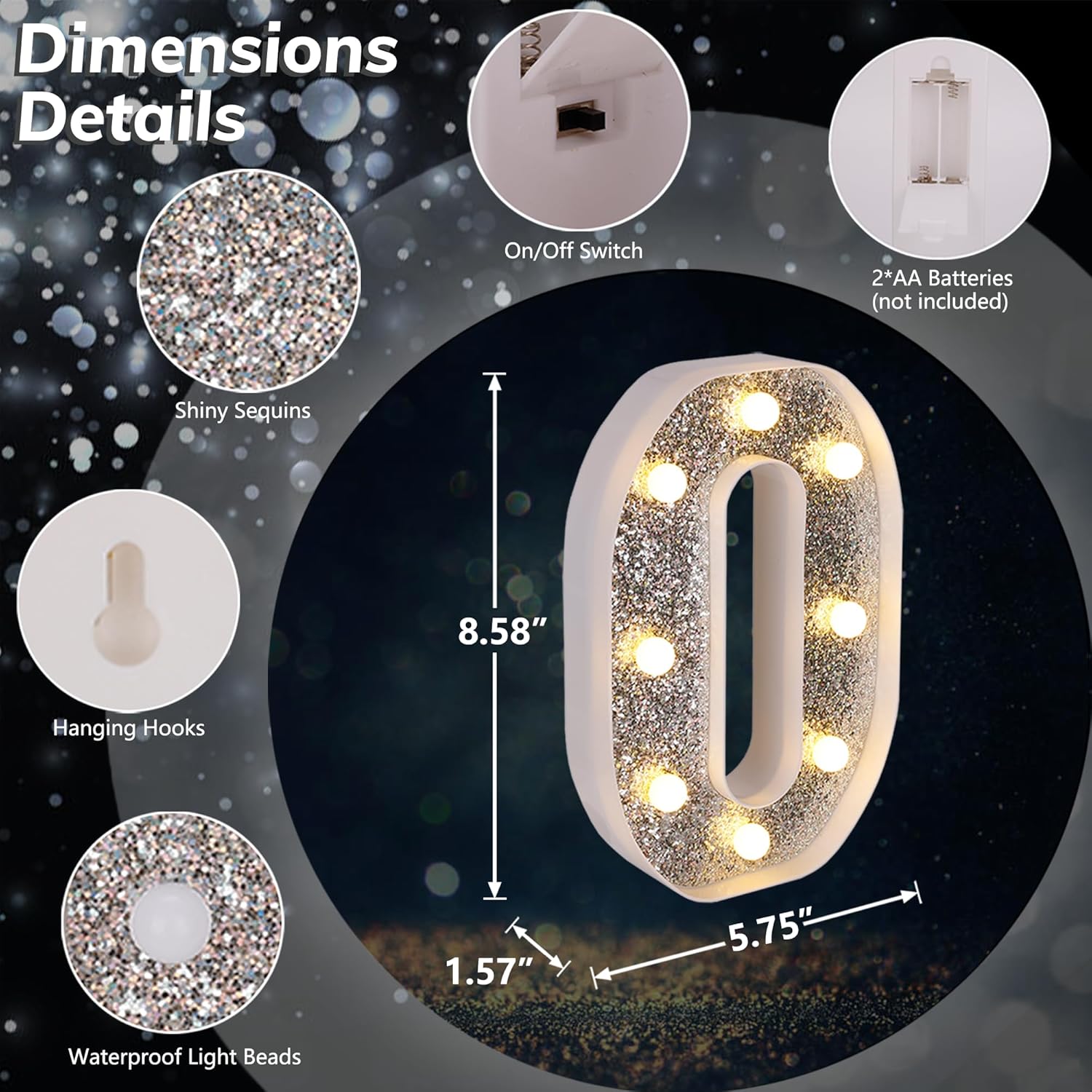 • 【Glitter Silver Marquee LED Letters】Unlike normal white lighted letters, these LED letter lights are covered with shiny silver glittering sequins. Whether it is turned on or off, these glitter marquee lights give a bright eye-catching glow. You can use it to beautify your dining table and light up your party. Create a dreamlike and romantic atmosphere.