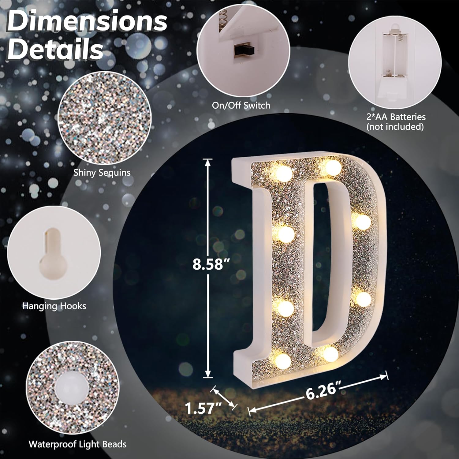 • 【Glitter Silver Marquee LED Letters】Unlike normal white lighted letters, these LED letter lights are covered with shiny silver glittering sequins. Whether it is turned on or off, these glitter marquee lights give a bright eye-catching glow. You can use it to beautify your dining table and light up your party. Create a dreamlike and romantic atmosphere.