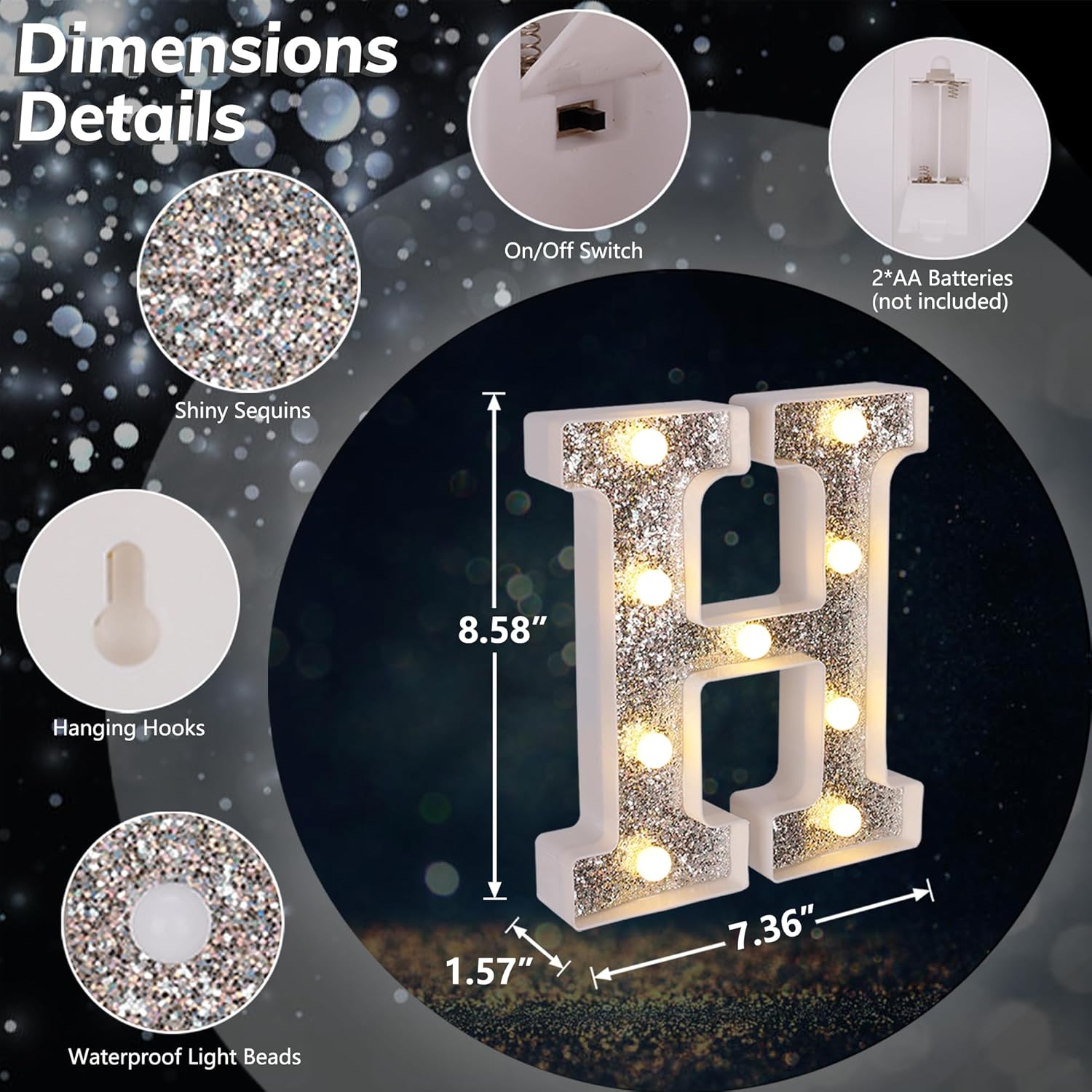 Marquee Light Up Letters, Glitter Silver LED Letter Lights Battery Powered Alphabet Letter Sign for Night Light Wedding Birthday Party Cafe Bar Decoration Girls Room Decor - letter H