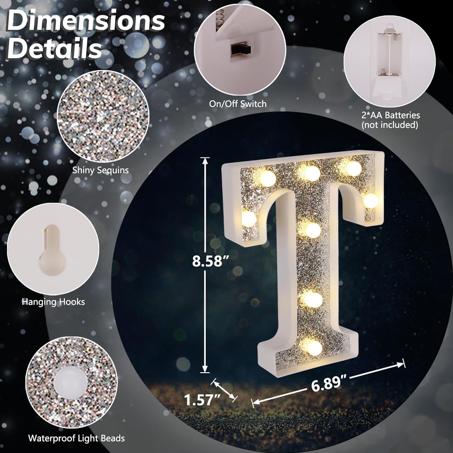 Marquee Light Up Letters, Glitter Silver LED Letter Lights Battery Powered Alphabet Letter Sign for Night Light Wedding Birthday Party Cafe Bar Decoration Girls Room Decor - T