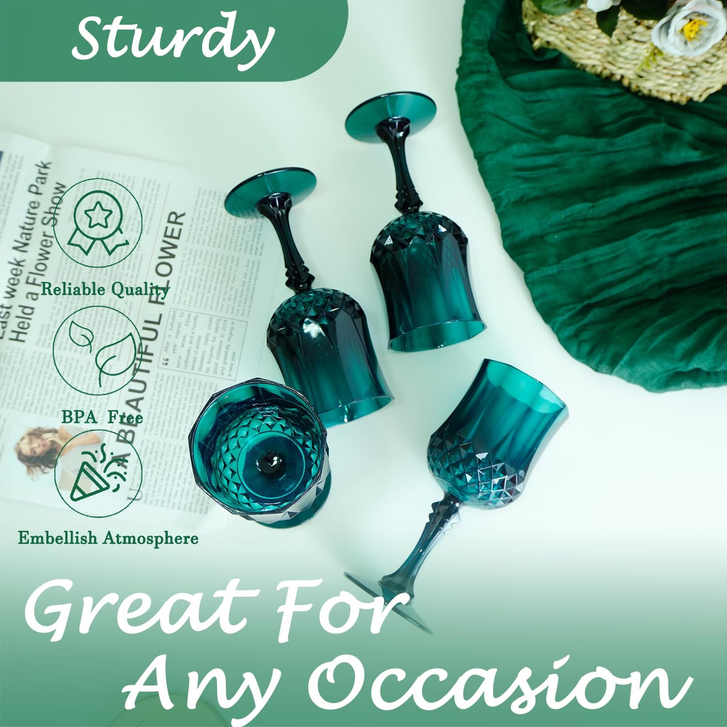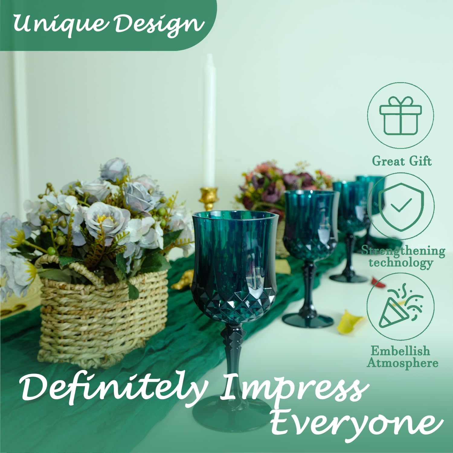 • 🍷🍷🍷【Product Description】 This set includes 24 retro-style dark green party plastic wine glasses, providing ample quantity to meet your daily use and replacement needs. The elegant and sophisticated design makes your wedding reception unique