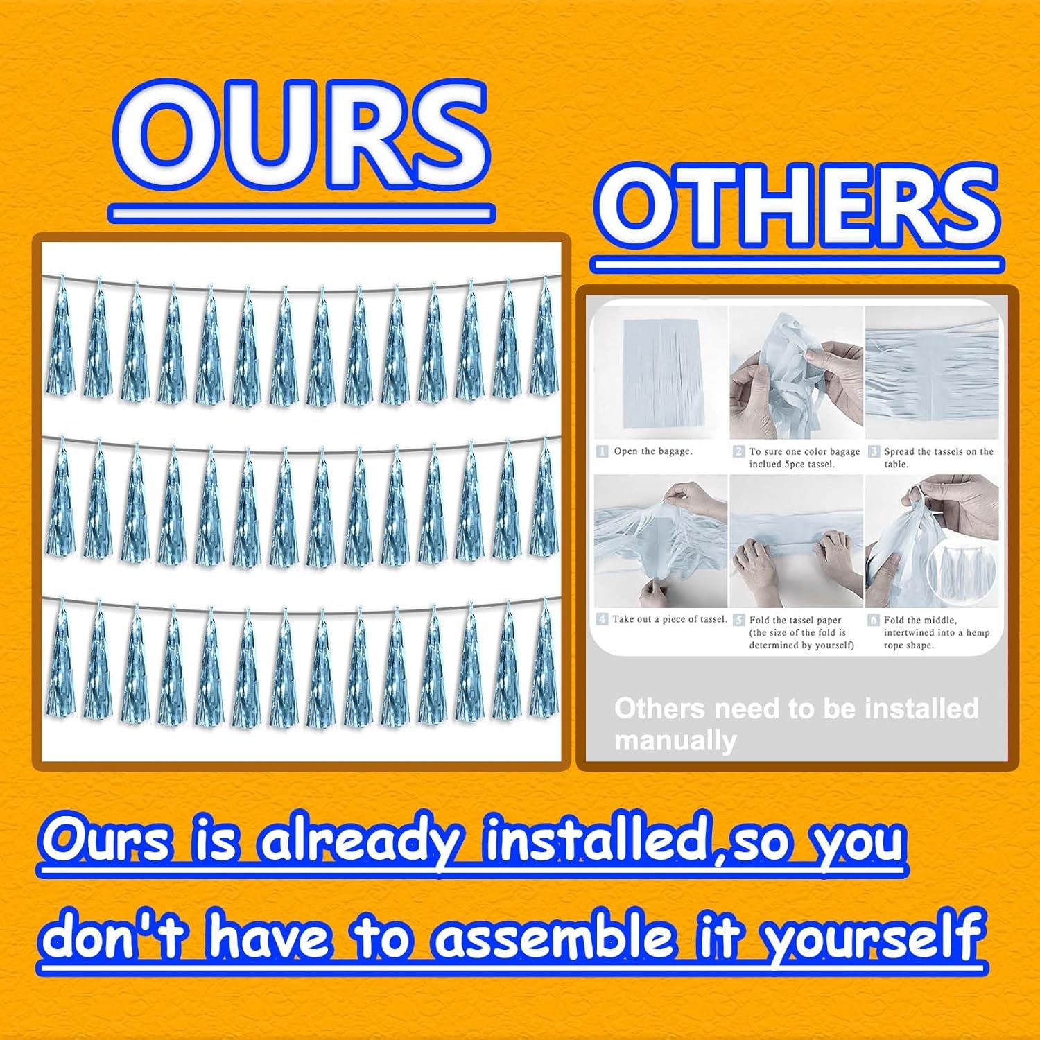 • 【Package Includes】The total length of the light blue birthday tassels banner is 30 feet, divided into 3 strips, each 10 feet long. Each banner contains 15 tassels, and each tassel measures 14 inches, for birthday decorations many occasions uitable for Patriotic display, Homecoming Float, Christmas Float, ecorative metal trailers, graduation floats etc