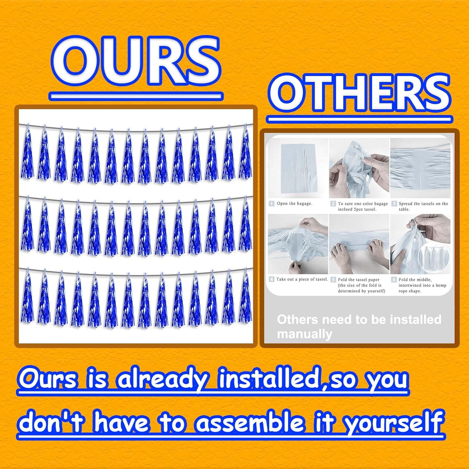• 【Package Includes】The total length of the blue birthday tassels banner is 30 feet, divided into 3 strips, each 10 feet long. Each banner contains 15 tassels, and each tassel measures 14 inches, for birthday decorations many occasions uitable for Patriotic display, Homecoming Float, Christmas Float, ecorative metal trailers, graduation floats etc