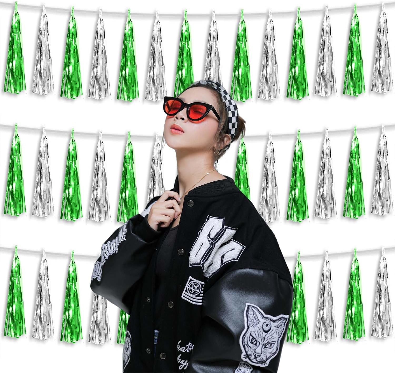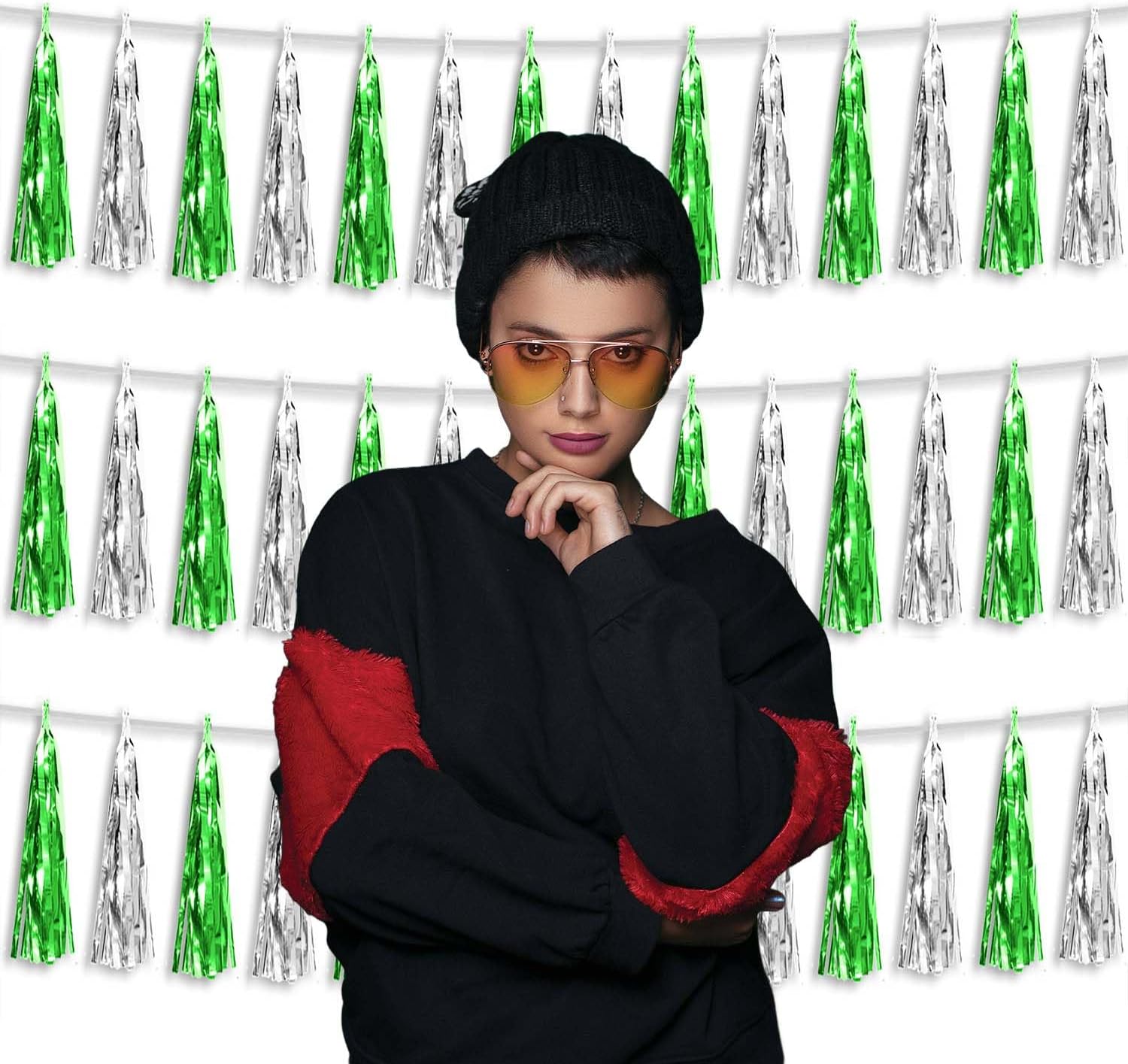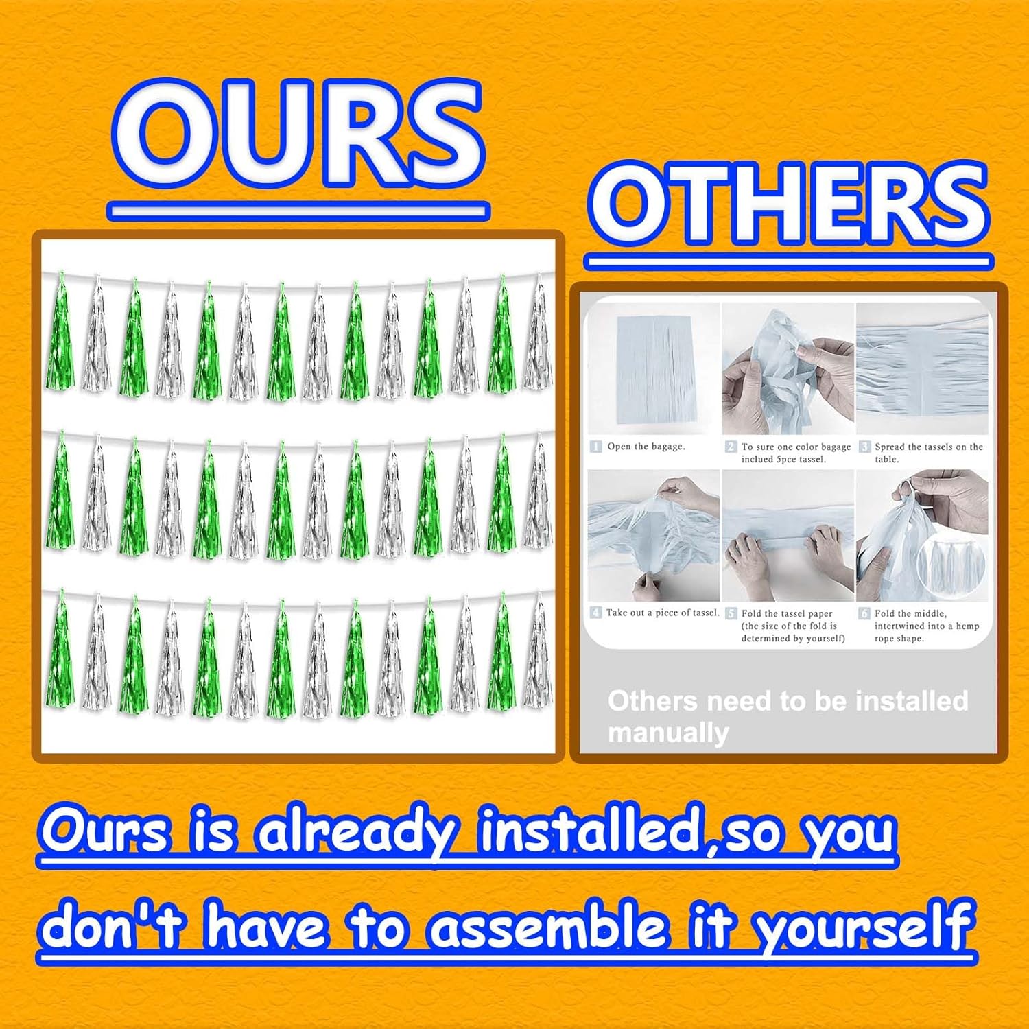 • 【Package Includes】The total length of the green silver birthday tassels banner is 30 feet, divided into 3 strips, each 10 feet long. Each banner contains 15 tassels, and each tassel measures 14 inches, for birthday decorations many occasions uitable for Patriotic display, Homecoming Float, Christmas Float, ecorative metal trailers, graduation floats etc