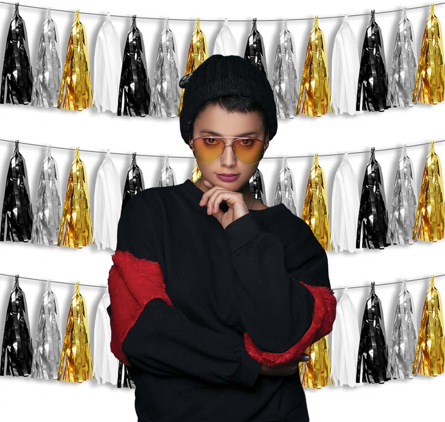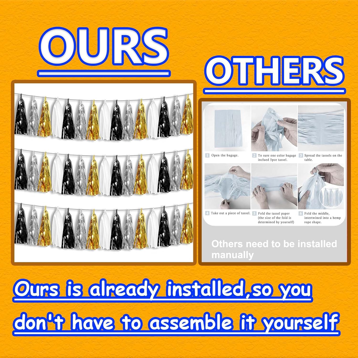 • 【Package Includes】The total length of the black gold silver birthday tassels banner is 30 feet, divided into 3 strips, each 10 feet long. Each banner contains 15 tassels, and each tassel measures 14 inches, for birthday decorations many occasions uitable for Patriotic display, Homecoming Float, Christmas Float, ecorative metal trailers, graduation floats etc