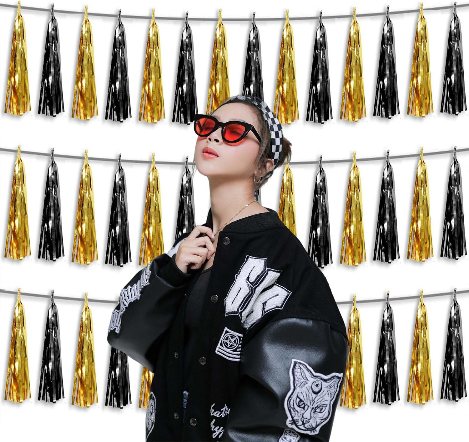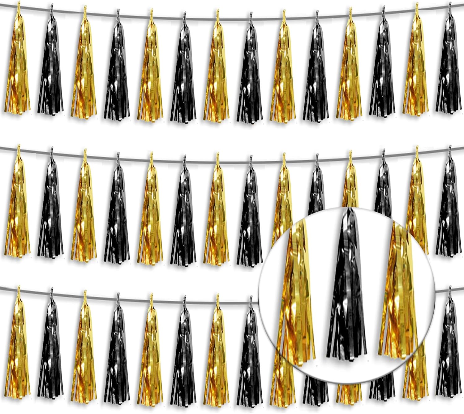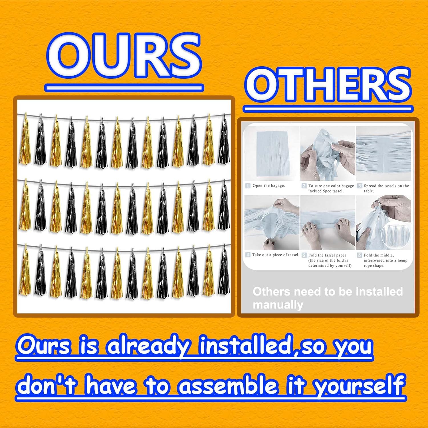 • 【Package Includes】The total length of the black gold birthday tassels banner is 30 feet, divided into 3 strips, each 10 feet long. Each banner contains 15 tassels, and each tassel measures 14 inches, for birthday decorations many occasions uitable for Patriotic display, Homecoming Float, Christmas Float, ecorative metal trailers, graduation floats etc
