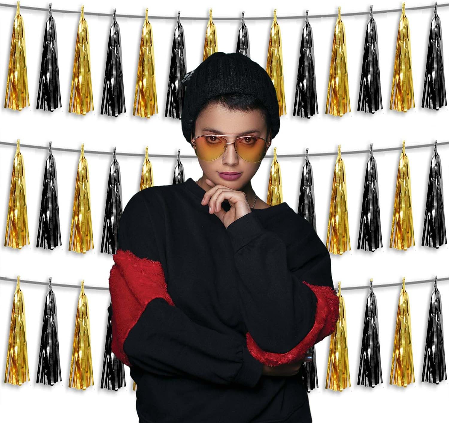 3P Metallic Fringe Tassel Banner Garland Foil Tinsel Streamer Wall Hanging Curtain Backdrop Banner for Parade Floats,Graduation Decorations, Father's Day,New Years Party Decoration(Black Gold)