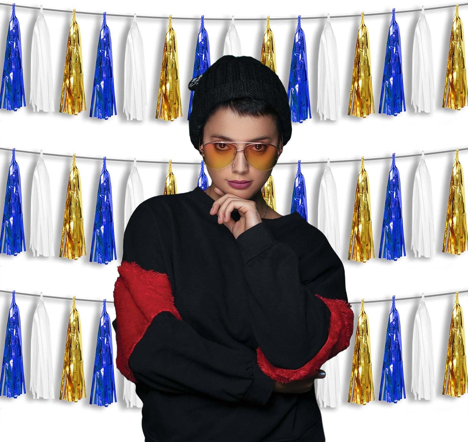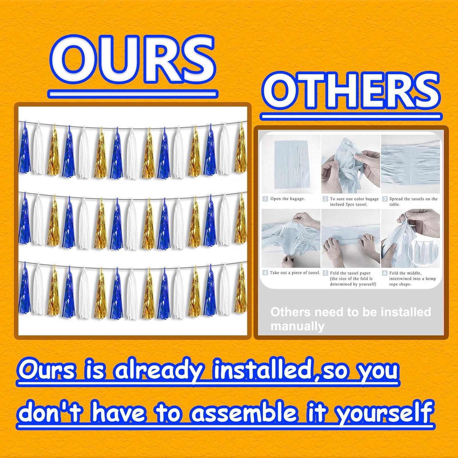 • 【Package Includes】The total length of the navy blue white gold birthday tassels banner is 30 feet, divided into 3 strips, each 10 feet long. Each banner contains 15 tassels, and each tassel measures 14 inches, for birthday decorations many occasions uitable for Patriotic display, Homecoming Float, Christmas Float, ecorative metal trailers, graduation floats etc