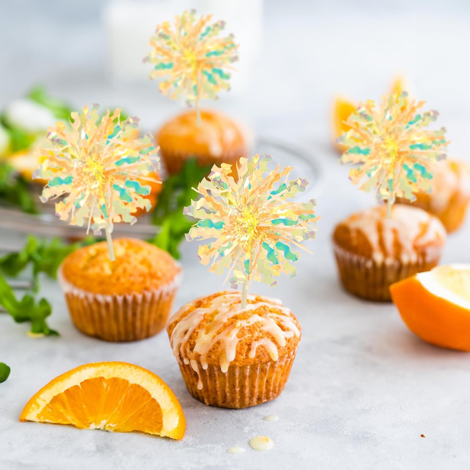 Ephlyn 30Pcs Foil Firework Cupcake Toppers Sparkle Tinsel Drink Birthday Cake Decorations Cocktail Food Fruit Toothpick for New Years Wedding Birthday Party Decorations Yellow