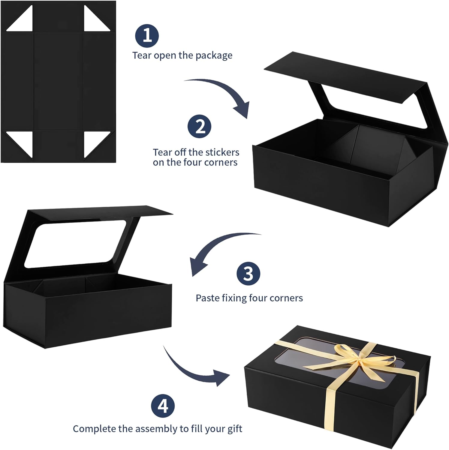 • 🎁GIFT BOX SIZE: Magnetic gift boxes,13.5x9x4.3 inches.Gift boxes are all flat transportation,Quick assembly, no extra tape required, easy to fold together in 2 steps, just peel off the triangle sticker, then assemble and glue the box. Save your valuable time and effort.
