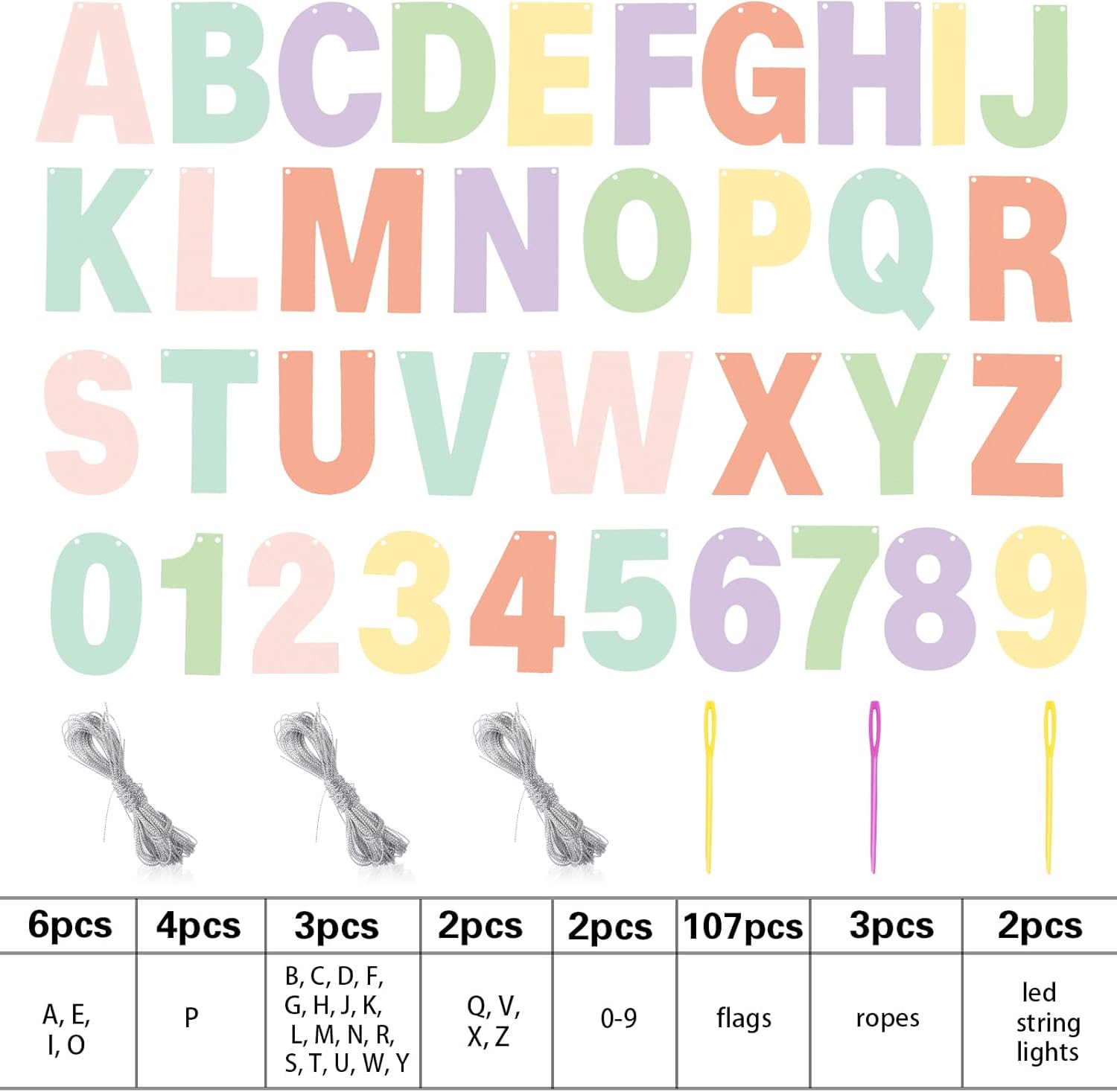 • DIY Banner Kit with Letters: you will get 107 pieces of letters and numbers, including 6 'A, E, I, O' letters, 4 'P' letters, 3 'B, C, D, G, H, J, K, L, letter M, N, R, S, T, U, letter W, Y, F shape' letters, 2 'Q, V, X, Z' letters and 2 '0-9' numbers, come with 3 ropes; Nice combination meet your various parties decorative demands