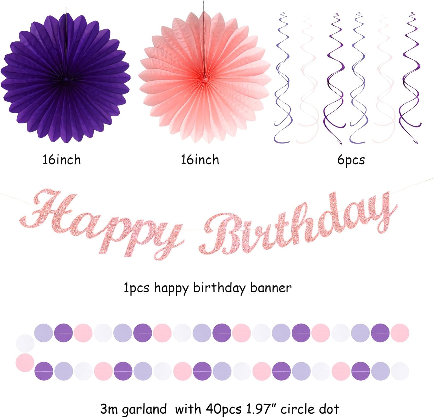 Purple Lilac-Lavender Pink Women Birthday Party-Decorations - 21pcs Happy Banner,Paper Lanterns Honeycomb,Tissue Pom Poms Flower Fan,Classroom Hanging Streamers Garland,Girls Decor Supplies Huglony