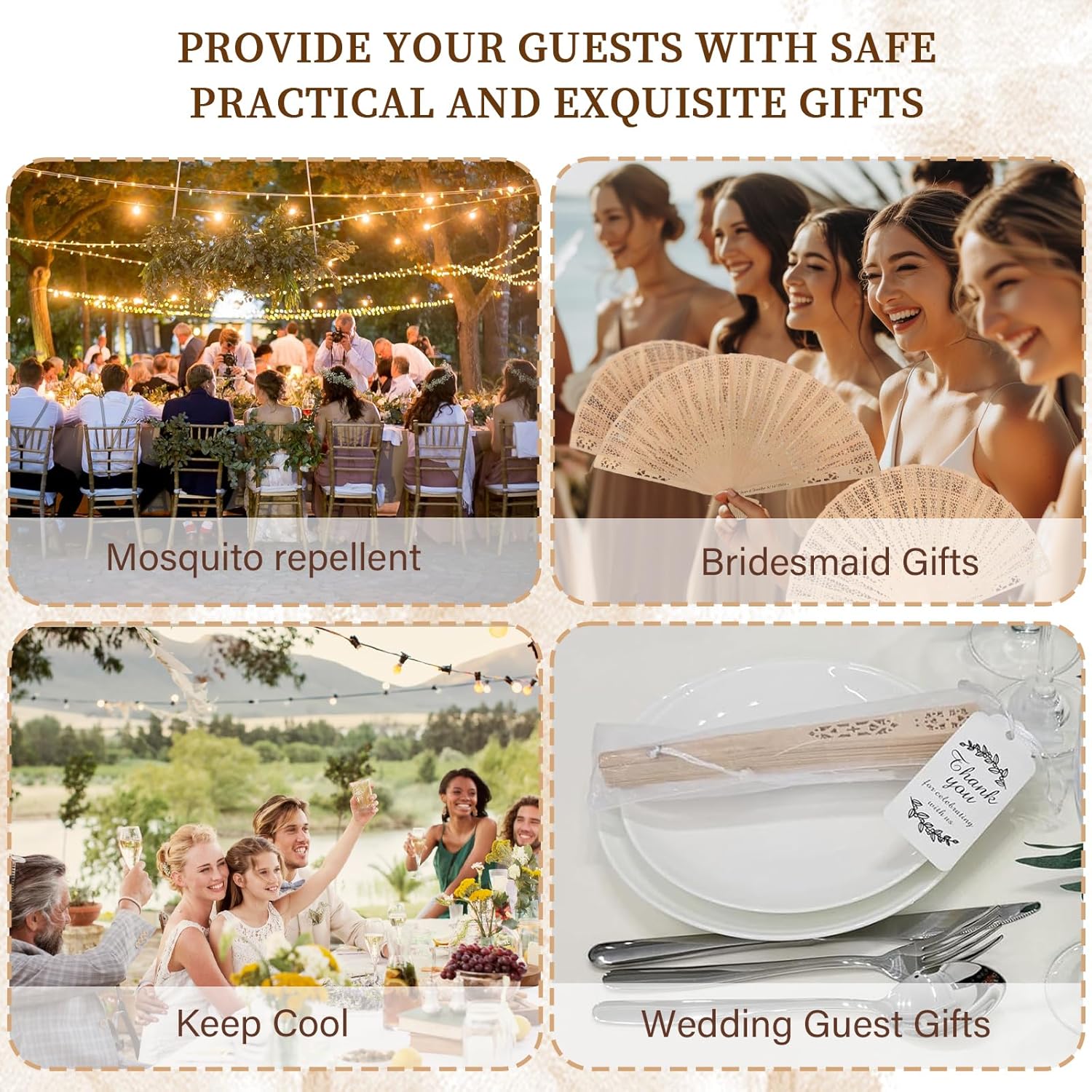 • Wedding Fans for Guests: This personalized sandalwood fan has a hollow design and beautiful shape, which not only keeps you cool in the summer, but also shows your elegant temperament. These wedding guest fans are lightweight and easy to carry, which is perfect for long-term use without getting tired. It is perfect for weddings, parties, concert fan teams, indoor and outdoor activities