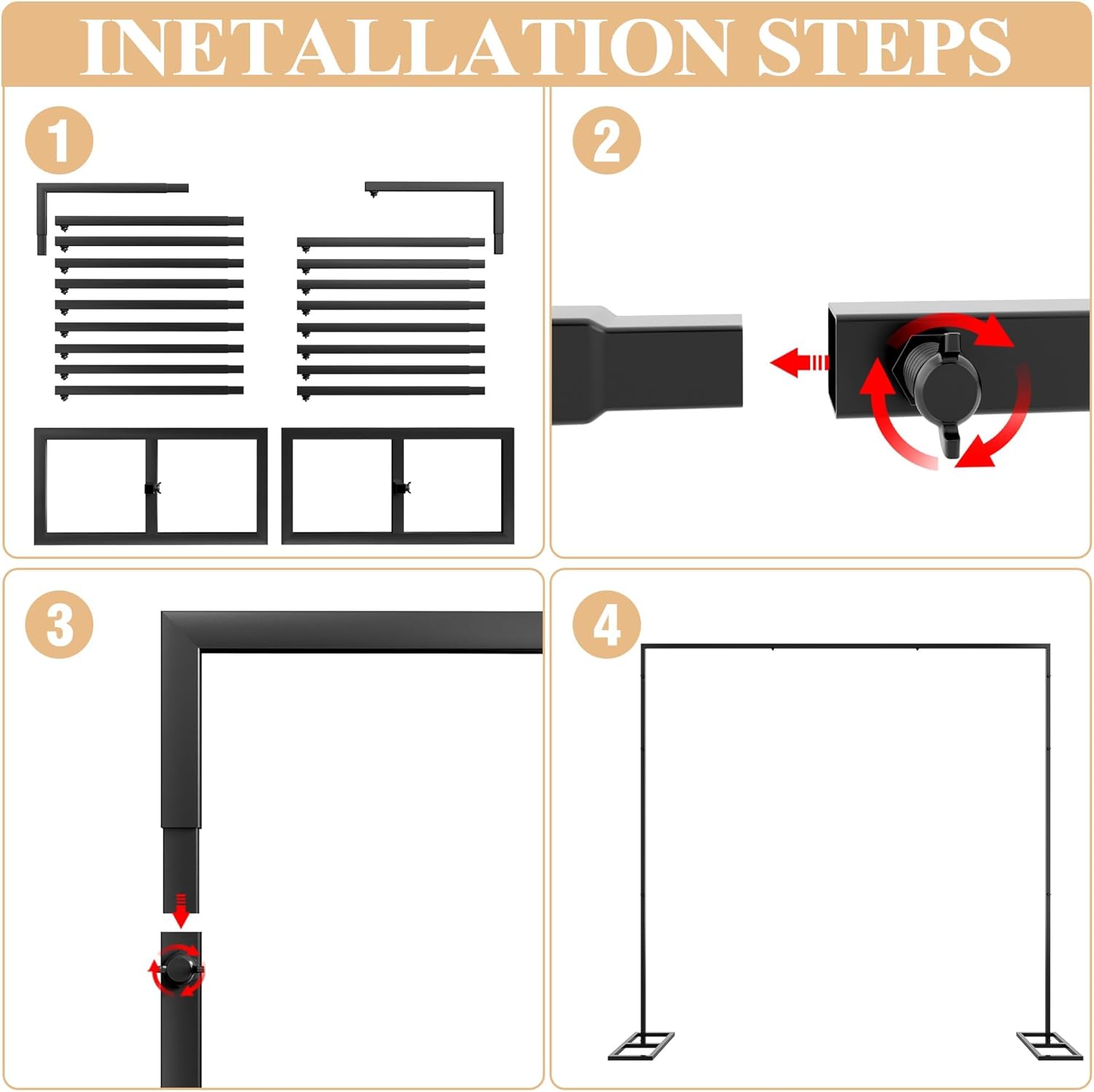 • 【Package Contains】 Black metal heavy duty backdrop stand contains L-shaped tube, L-shaped tube with one screw, Short straight tube and Rectangular base. Drape not included. These shiny white square arch backdrop stand with unmatchable class and elegance will add more color and atmosphere of festivity to your party.