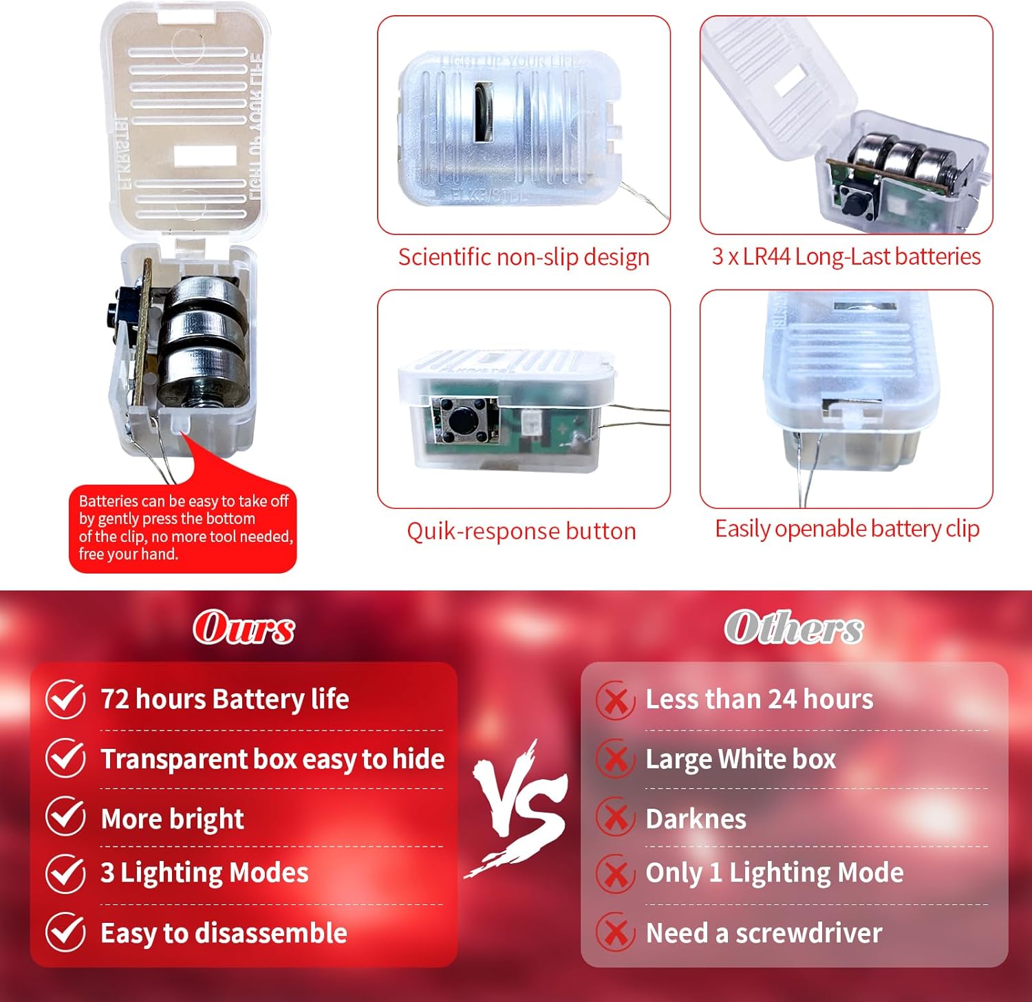 • 3 LIGHTING MODES AND WAIDELY APPLICATION: The fairy lights are super convenient enables to switch 10 flashing modes, Fast Twinkling, Slow Twinkling and Constant Lighting; This versatile battery operated lights can be used for Christmas decoration, holiday, Halloween parties, Valentine's Day, wedding, bedroom and centerpiece table decorations. Giving you different decorative effect and romantic atmosphere