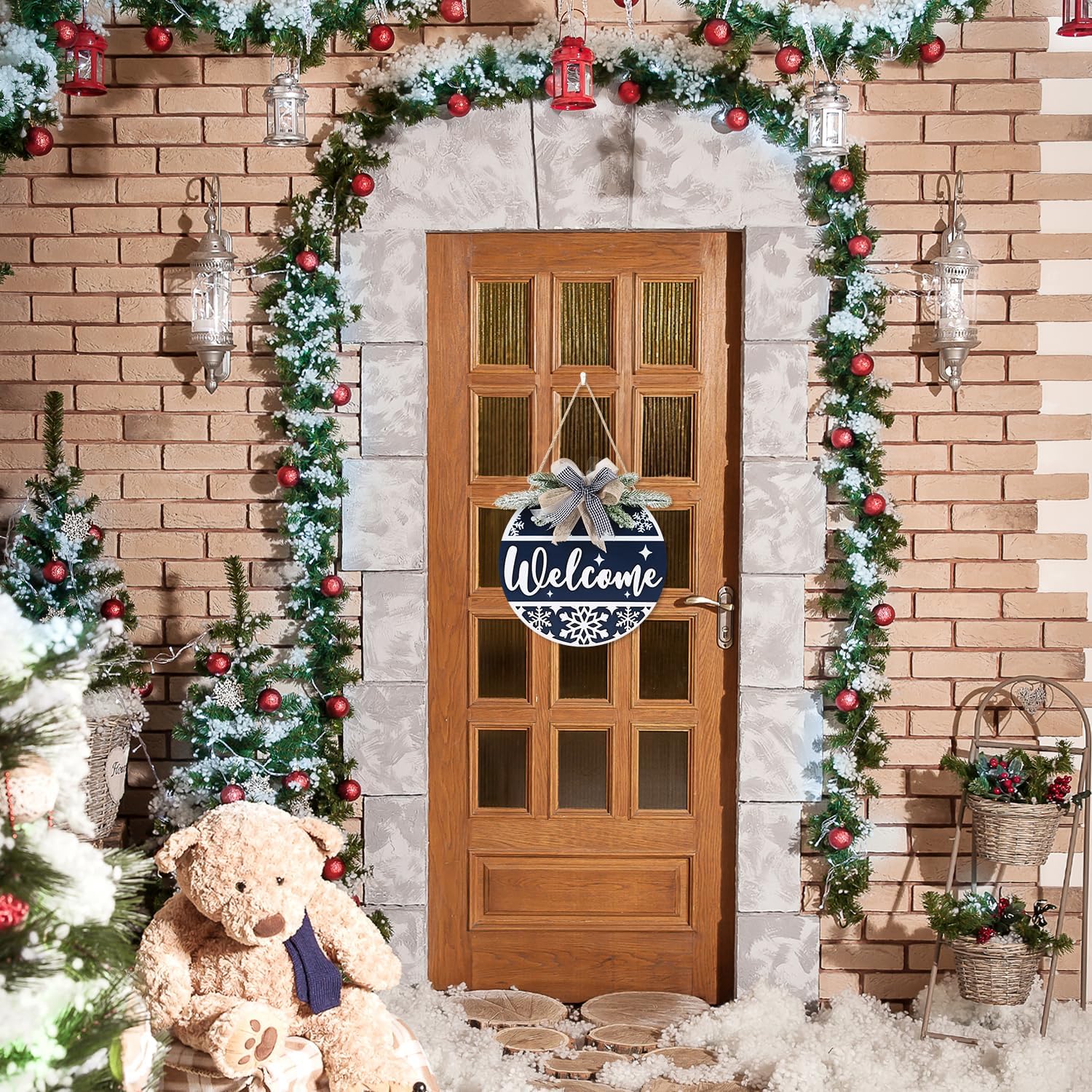 CHDITB Blue Welcome Winter Front Door Sign Wreath(11.4”), Wooden 3D Welcome Home Decoration Wall Hanging with Plaid Bow Snowflake, Farmhouse Christmas New Year Decor for Home Office