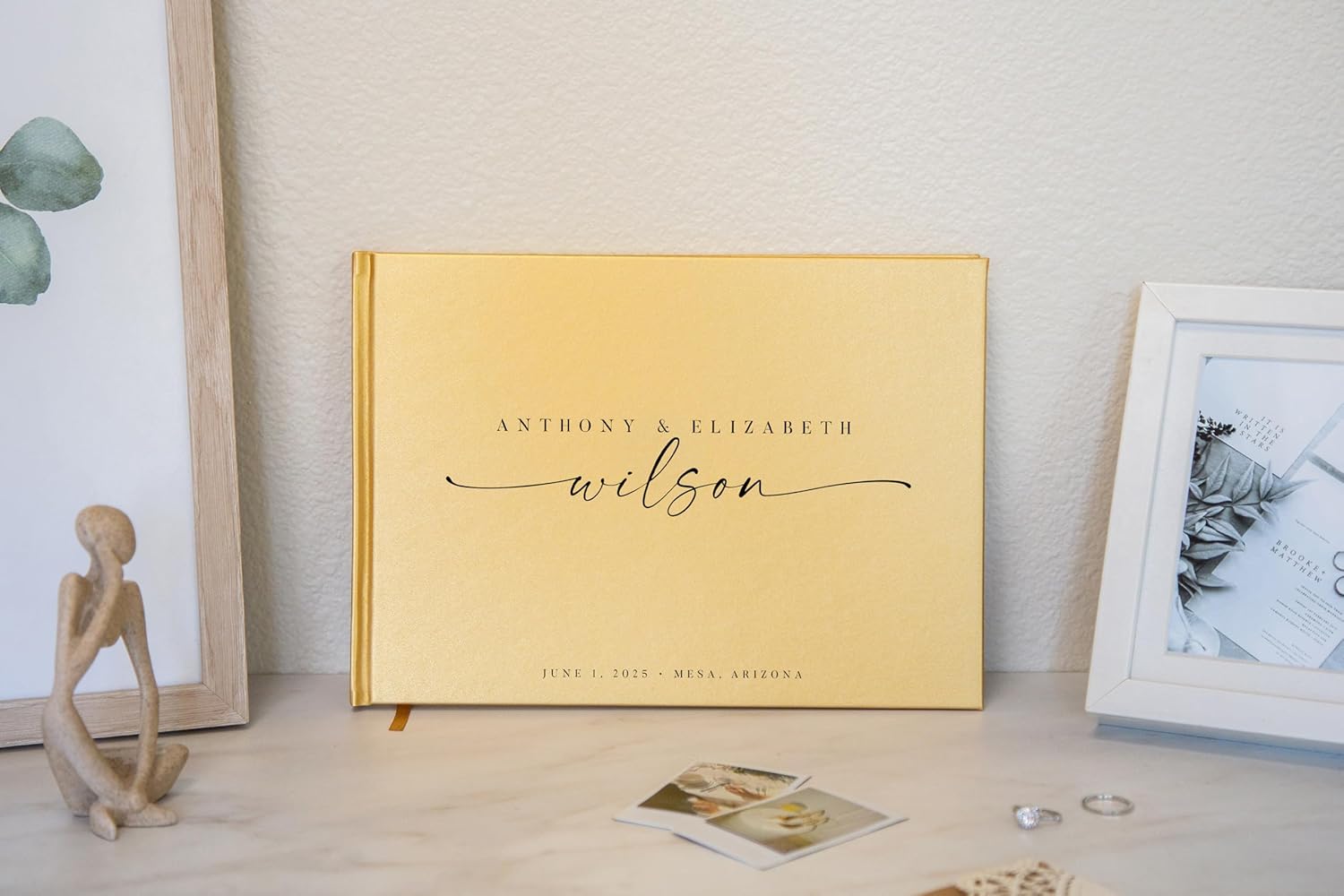 • Capture your special moments with our Personalized Guest Book, designed in a smooth gold metallic hardcover for a modern look. Measuring 11.5" x 8.5", this guest book features custom bride and groom names, including the couple’s last name in a cursive font, adding a unique and personal touch to your wedding decorations.