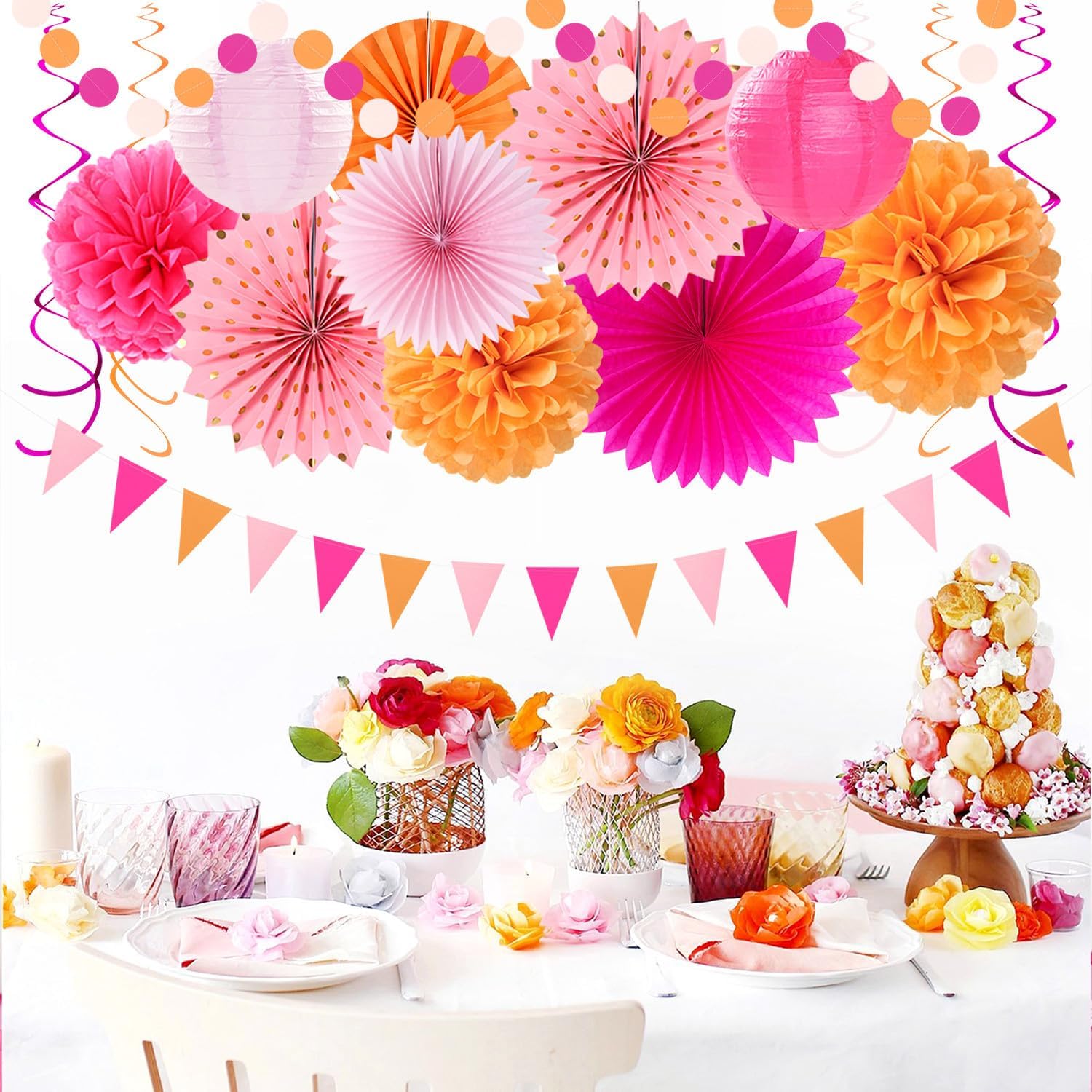 Hot-Pink Burnt-Orange Fall Party Decorations - 33pcs Birthday Baby Shower Banner,Streamers Tassel Garland,Sunset Autumn Thanksgiving Tissue Pom Poms,Paper Lantern Fans,Wedding Backdrop Decor Hugtmr