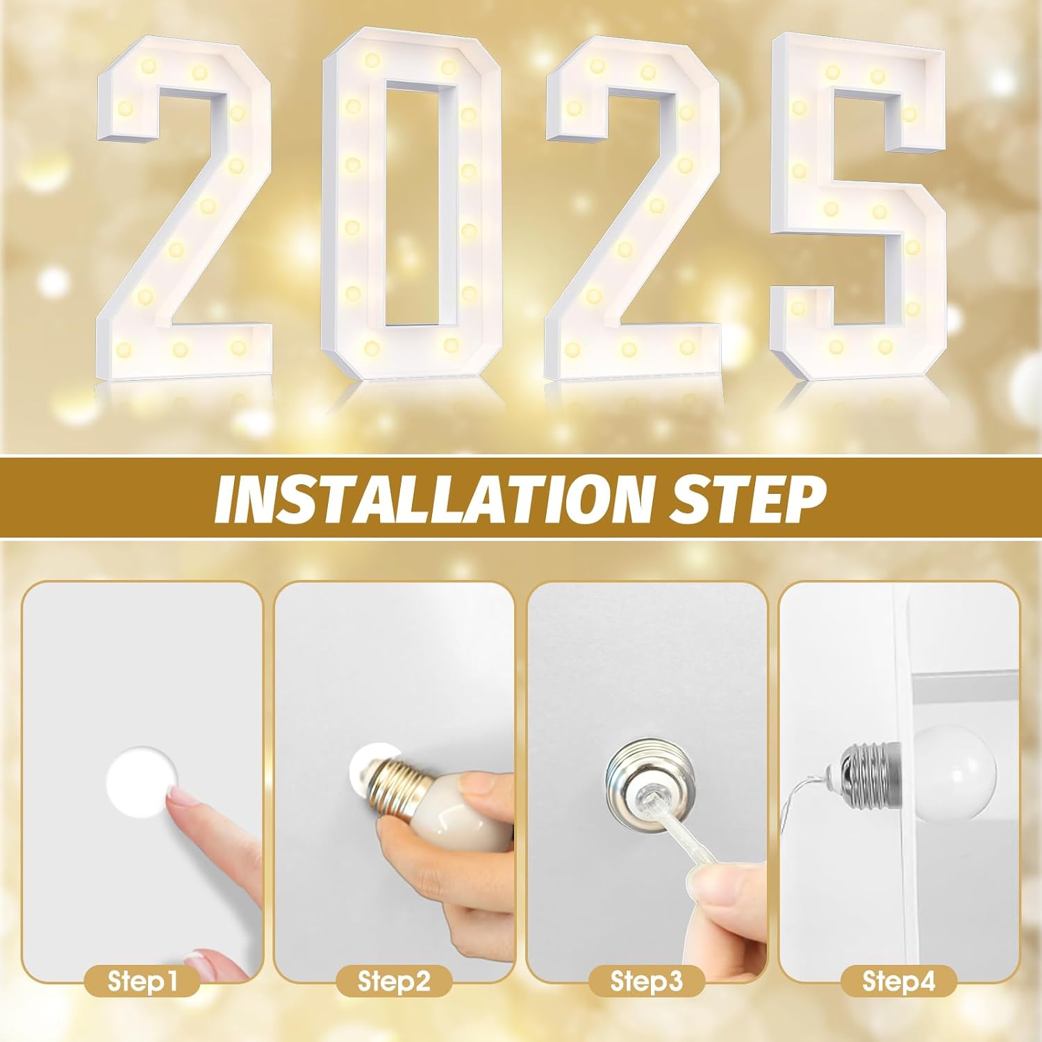 • 【Assembly Required】Each marquee numbers is made of precisely pre-cut foam board, comes with the same model of light string and LED bulb, and a user-friendly instruction manual. According to our installation manual, ① Fold the side panels along the cutting line and stick them to the bottom panel with hot melt glue according to the corresponding number. ② Screw the bulb onto the single board, and then install the LED light string into the bulb. (Note: Glue gun and battery not included)