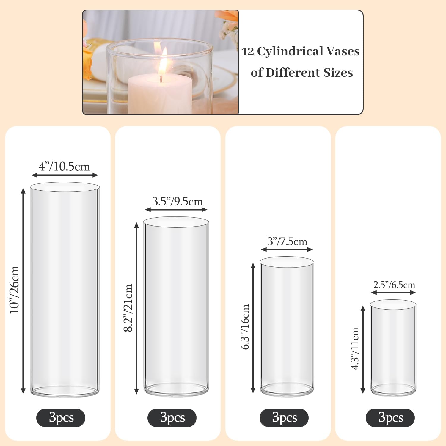 12 PCS Clear Cylinder Vases for Centerpieces | 4, 6, 8,10 Inch Tall Flower Vase for Wedding Decorations, Clear Floating Candle Vases in Bulk, Hurricane Candle Holders for Table, Home Décor