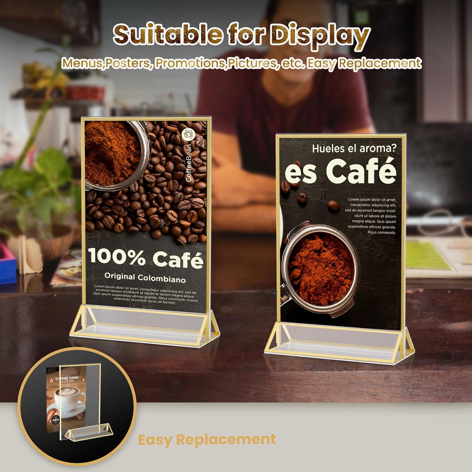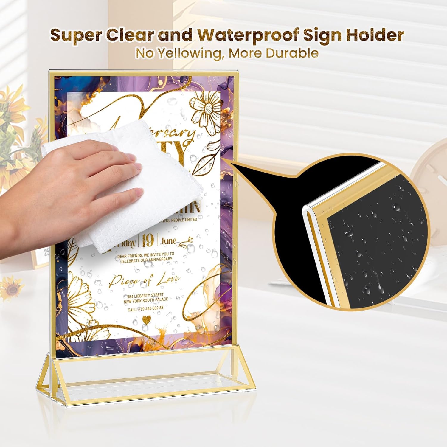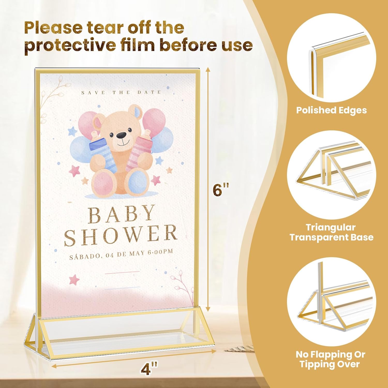 • 【EASY TO ASSEMBLE】These gold picture frames are incredibly easy to install. Simply open the double-sided display frame, place your sign inside, and insert the holder into the base. Plus, the detachable design makes them convenient to store and transport, too.