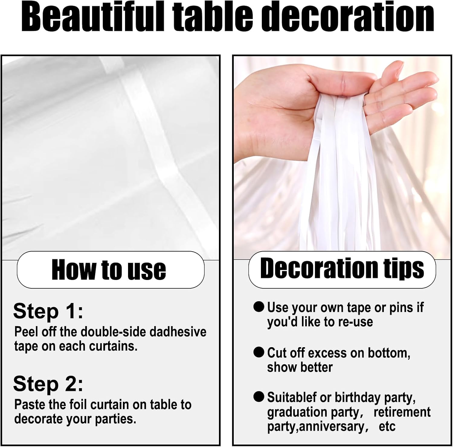 • Easy to Use: the foil fringe table skirts are made of metallic foil, lightweight and easy to use; Each metallic fringe table skirts comes with self-adhesive tape on the top for easy attachment to your wall or table, great for your party venue decoration.