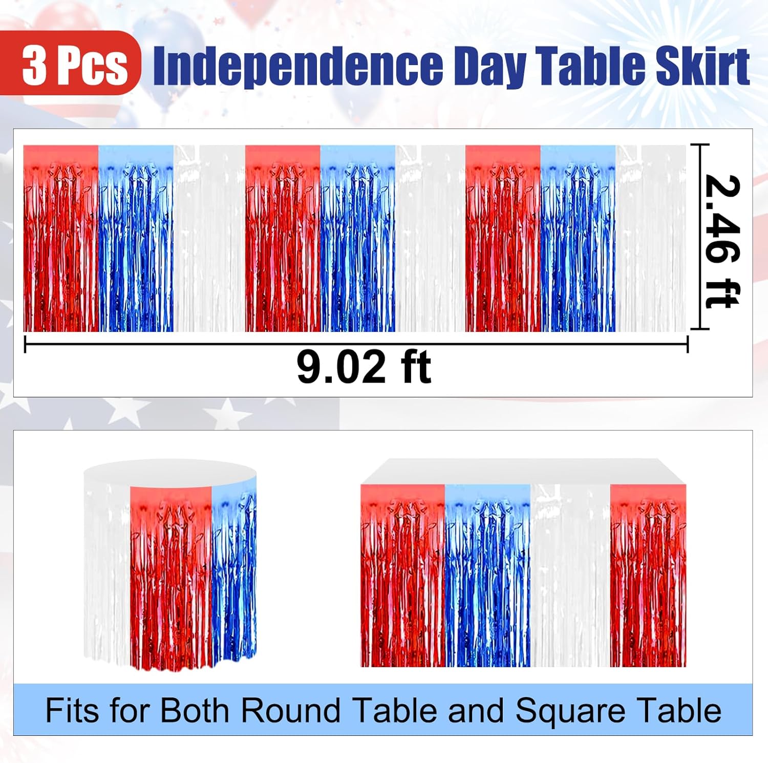 3 Pack 29 x108 Inch White Blue Red Foil Fringe Table Skirts Metallic Banner for Tinsel Streamer Garland Backdrop for Parade Floats Wedding Thanksgiving Birthday Christmas New Year Party Decoration