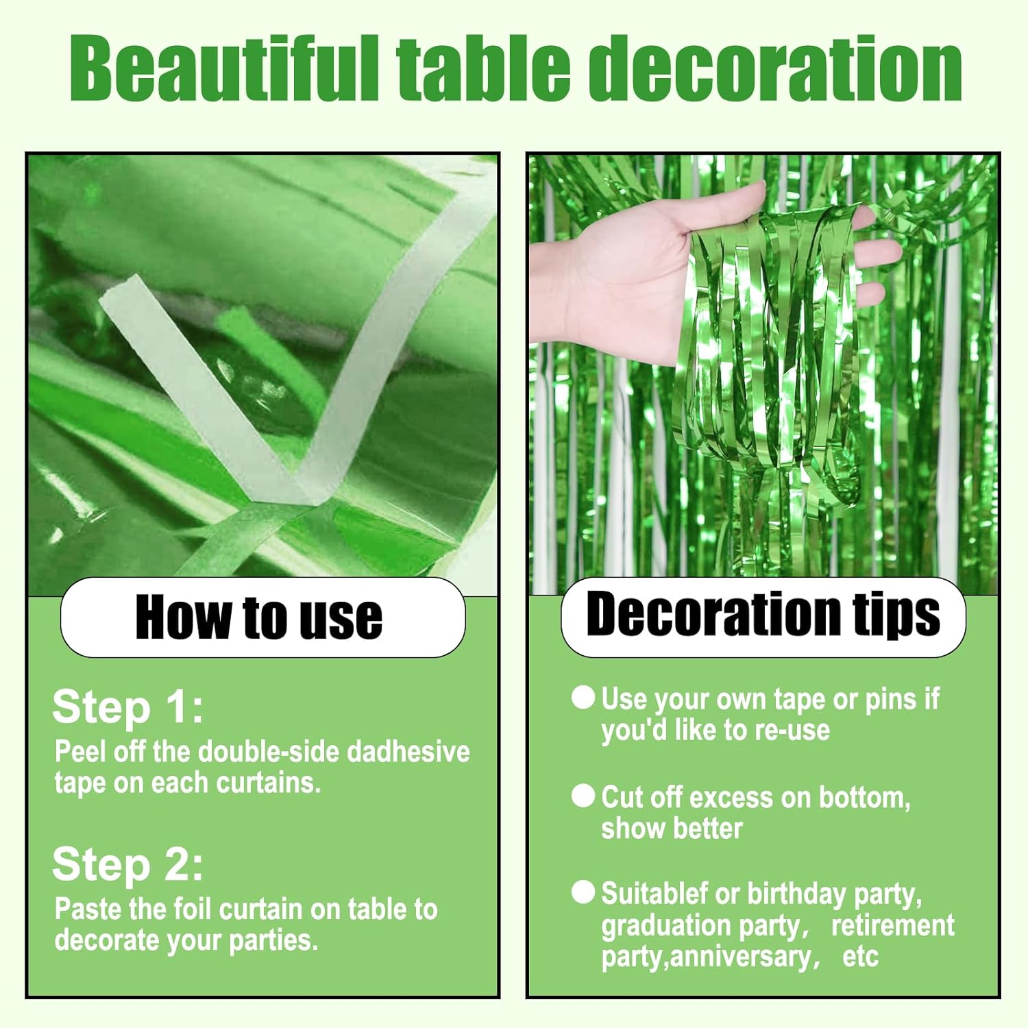 • Easy to Use: the foil fringe table skirts are made of metallic foil, lightweight and easy to use; Each metallic fringe table skirts comes with self-adhesive tape on the top for easy attachment to your wall or table, great for your party venue decoration.