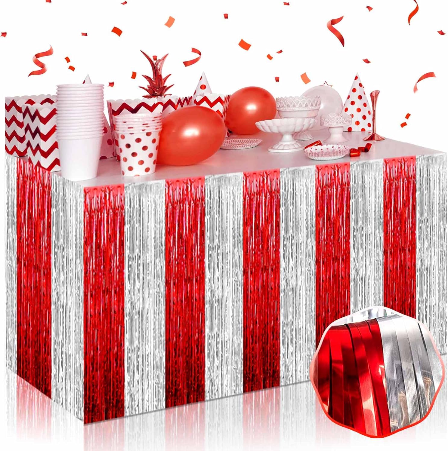3 Pack 29 x108 Inch Red Silver Foil Fringe Table Skirts Metallic Banner for Tinsel Streamer Garland Backdrop for Parade Floats Wedding Thanksgiving Birthday Christmas New Year Party Decoration