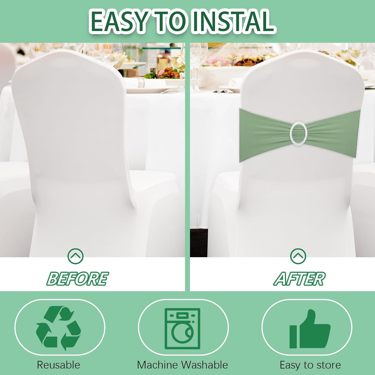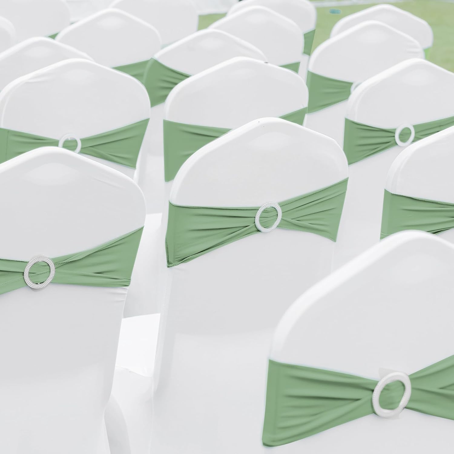 CHENGU 150 Pieces Spandex Stretch Chair Sashes Bows Elastic Chair Cover Bands Ties with Buckle Slider for Wedding Party Reception Events Universal Ceremony Banquet Decorations(Sage Green)